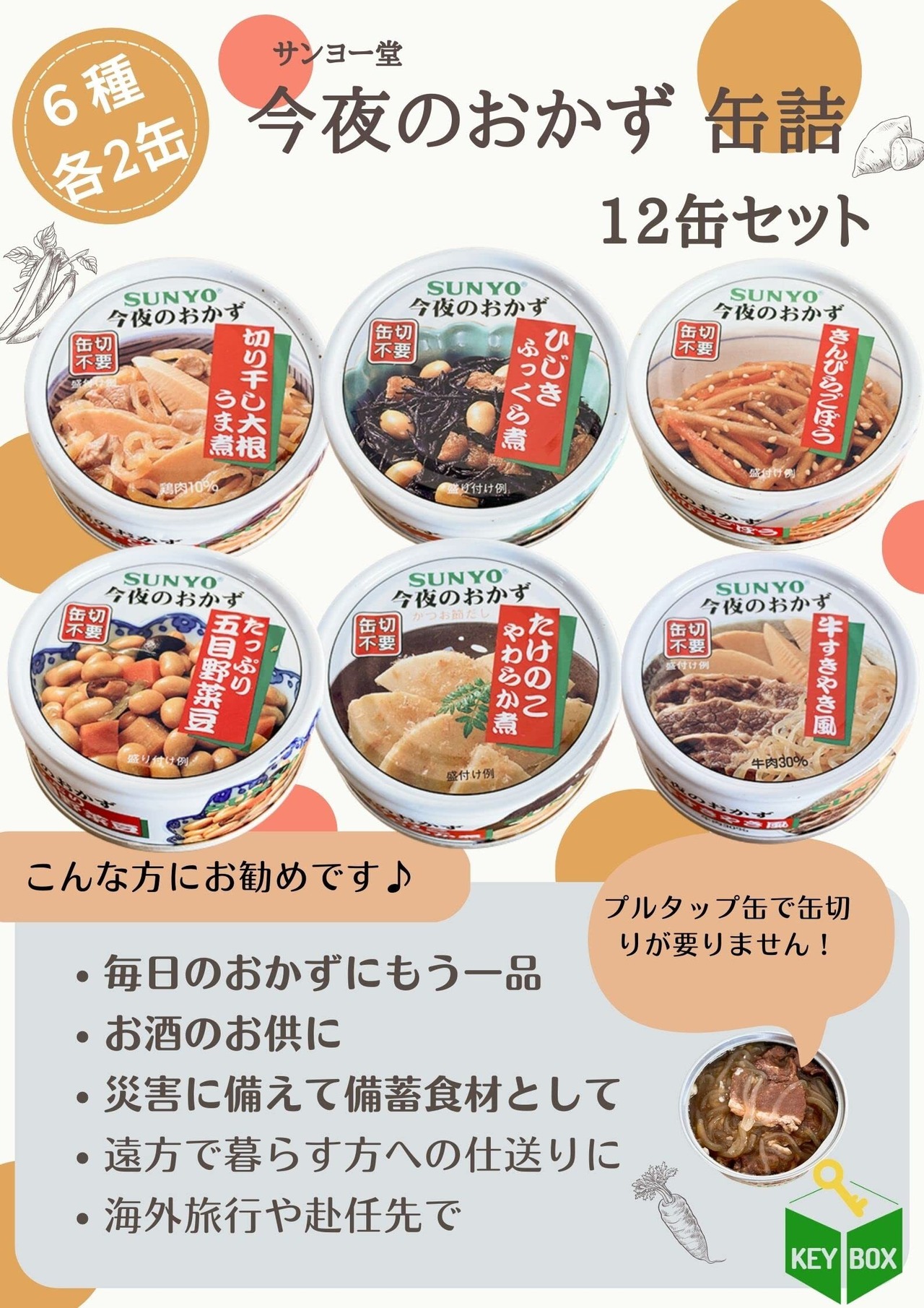【12缶セット】サンヨー堂 缶詰 おかず 詰め合わせ 長期保存 (賞味期限:2029年6月以降)セット サンヨー 非常食 防災 備蓄 保存食 (6種x2缶) KeyBoxオリジナル賞味期限シール付き (12缶セット)