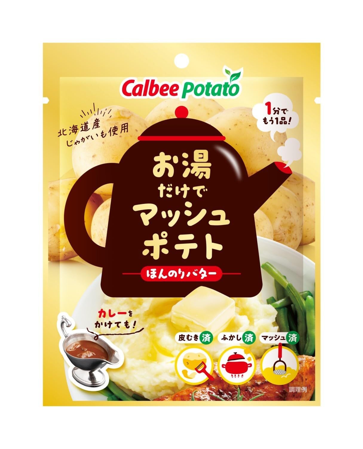 お湯を入れてかき混ぜるだけ、約1分で簡単に味付きのマッシュポテトが完成します!味付きなのでそのままおつまみとしても。食べ方も色々、ポテトサラダやコロッケはもちろん、グラタンやスープ等色々なじゃがいも料理に使えます。冷ませてお子様と一緒に星型やハート形等を作ってみるのもオススメです。