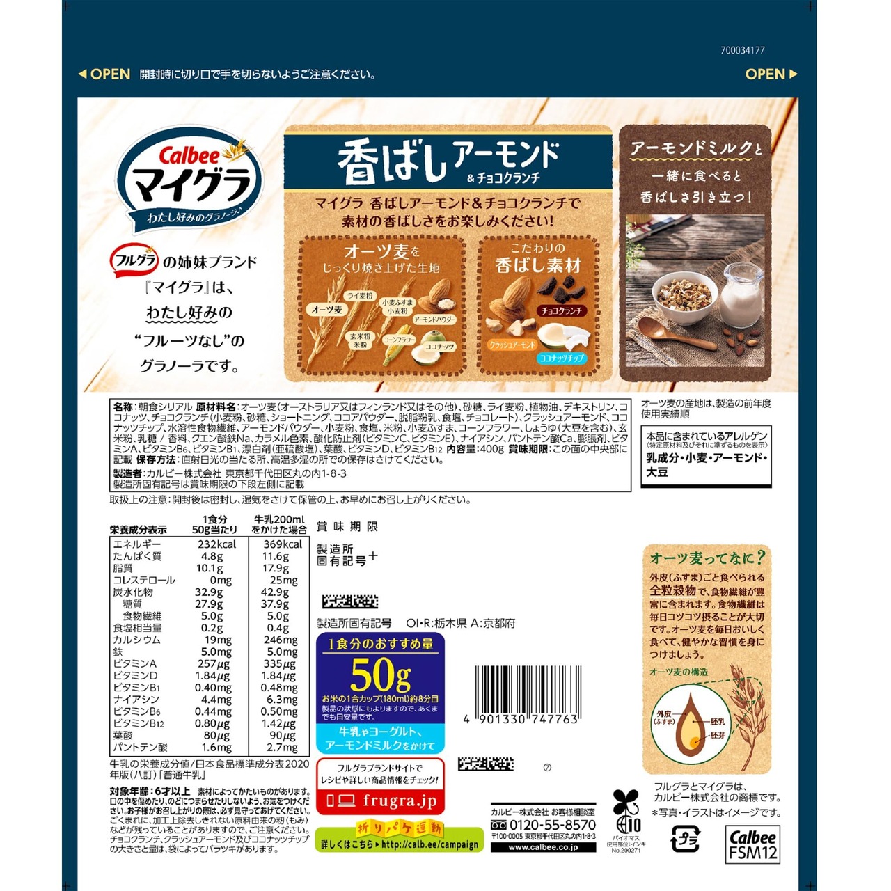 [フルグラ]カルビー ベイクドオーツ・マイグラ香ばしアーモンド&チョコクランチ 計4袋