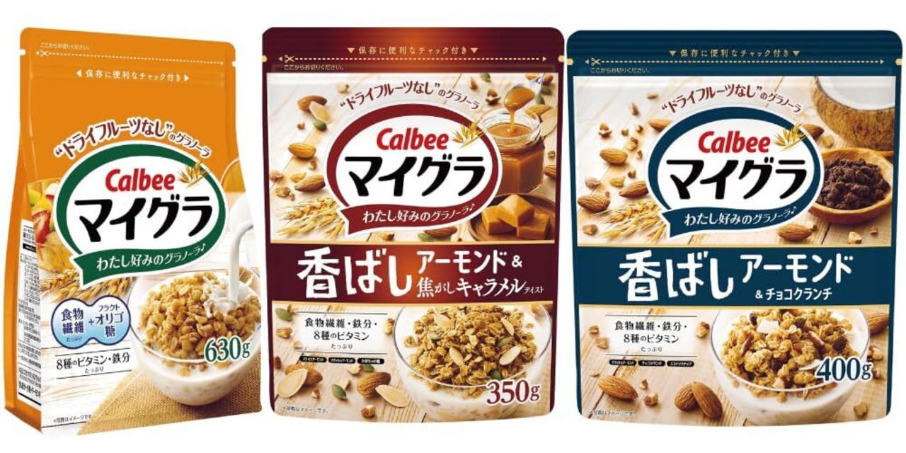 ・カルビー マイグラ 3種 各1袋 セット ・内容 マイグラ 630g 香ばしアーモンド&焦がしキャラメルテイスト 350g アーモンド&チョコクランチ 400g