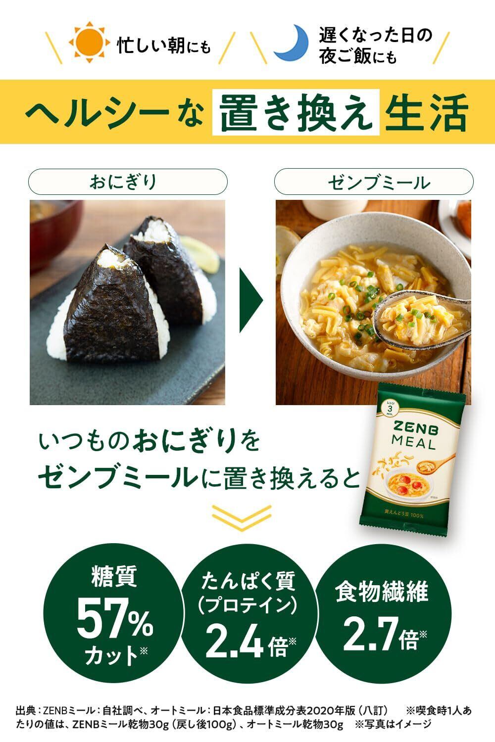 累計販売食数1800万食を突破した「 ZENBヌードル ( ゼンブヌードル )」と同じ、スーパーフード黄えんどう豆を使った、豆100%オートミール*1「ゼンブミール」。ゼンブミールは話題のオートミールよりも、たんぱく質1.4倍*2、食物繊維1.4倍*2、ビタミンB1 3.4倍*2、脂質61%OFF*2。いろいろな栄養がとれるのに、1食99kal。オートミールのようにお米代わりやスープに入れて食べるだけなので簡単。(*1:オーツ麦は使っていません。*2参照:日本食品標準成分表2020年版(八訂)喫食時1人前当たりの値は、ZENBミール乾物30g(戻し後100g)、オートミール乾物30g)