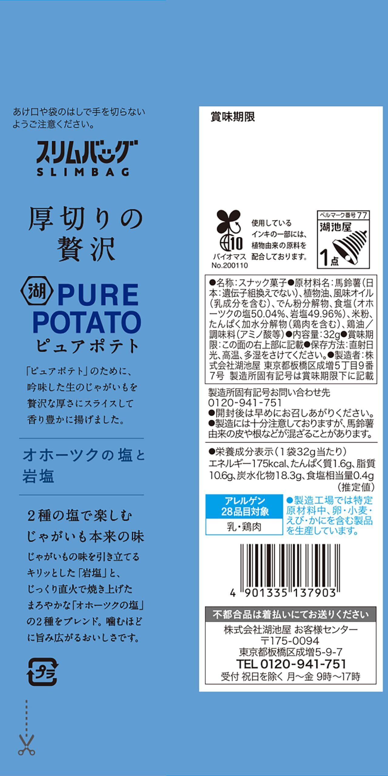 湖池屋 スリムバッグ じゃがいも心地 厚切りひとくちカット オホーツクの塩と岩塩 32g×24袋