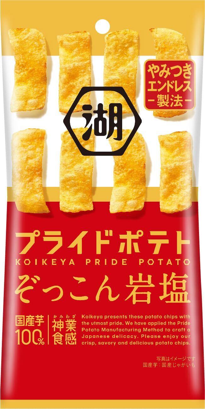 老舗・湖池屋のプライドをかけて。まるで料理のように、独自の製法で作る、本当においしいポテトチップスの登場! やみつき感と常習性を徹底的に追求した味覚改良を実施した、「やみつきエンドレス製法」を採用! やみつきエンドレス製法」・・・これまでのポテトチップスの枠を飛び越えた、ポテトチップス好きが夢中になる美味しさを追求し、湖池屋独自の新製法。 プライドポテトのおいしさのヒミツである独自のこだわり製法に、新たに動物性のうまみ含有オイルでの味付けを取り入れることで、これまでにない常習性・やみつき感を付与!