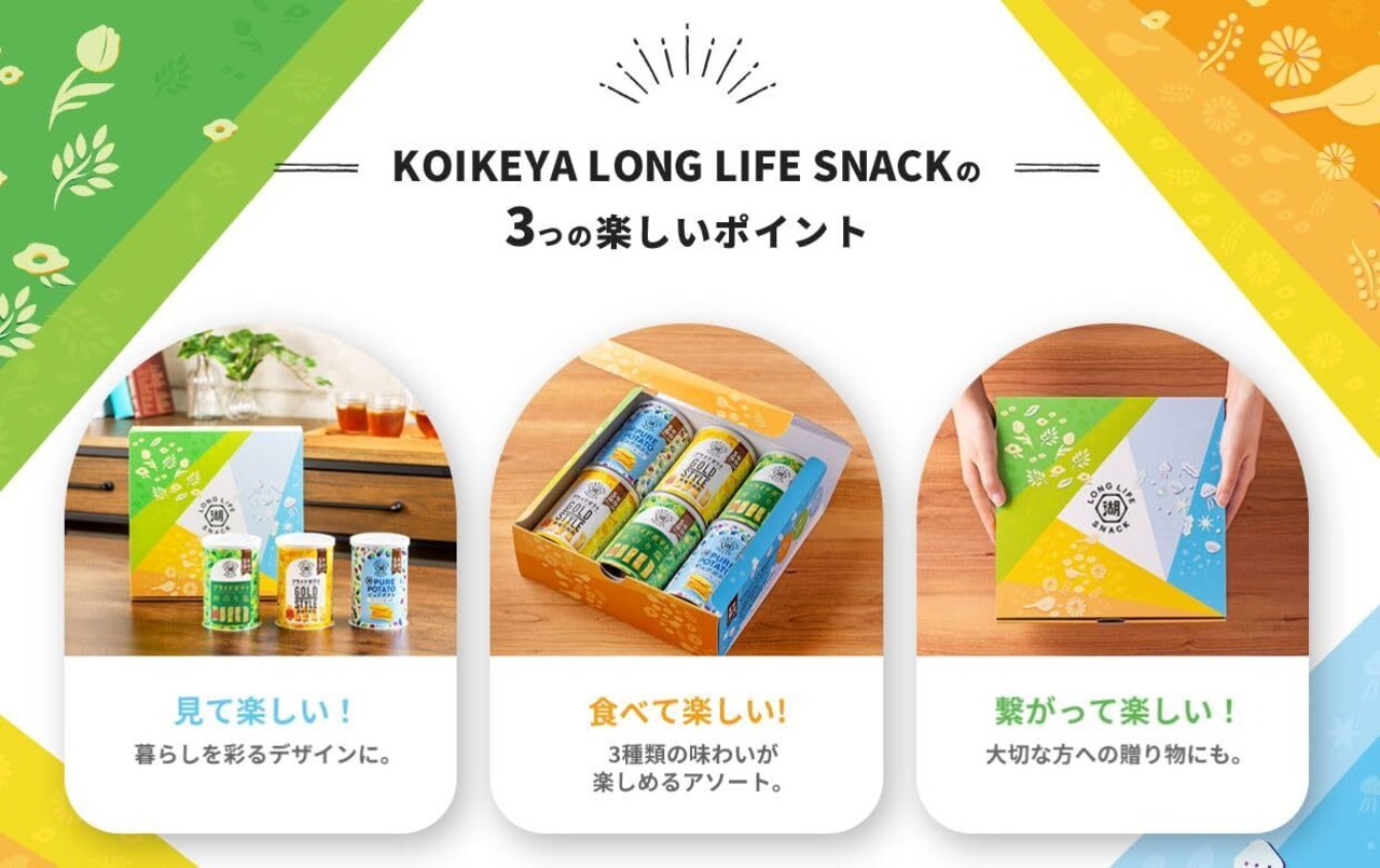 製造から5年保存可能なポテトチップス KOIKEYA LONG LIFE SNACKとは長期保存可能の缶入りスナックです。 日常ではもちろん、非常時においても みなさまに活力や癒しのひとときをお届けいたします。
