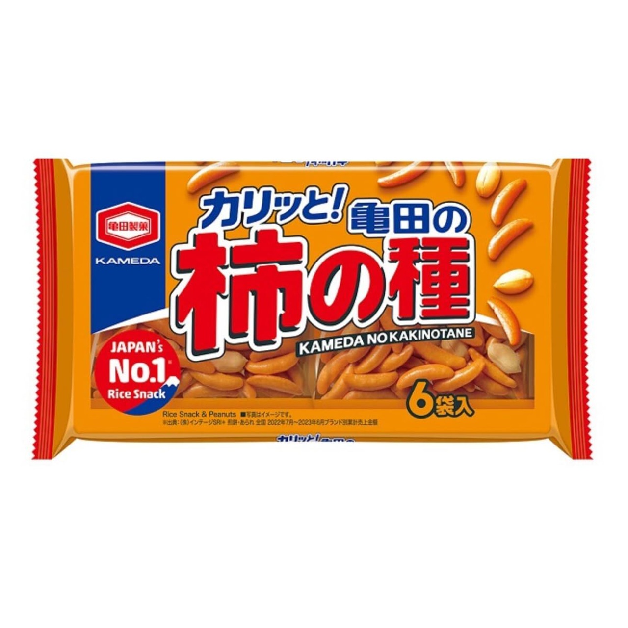 【亀田の柿の種】◆原材料:米粉(うるち米(国産))、でん粉、ピーナッツ(ピーナッツ、植物油脂、食塩)、しょうゆ、砂糖、魚介エキス調味料、たん白加水分解物、こんぶエキス、食塩/加工でん粉、調味料(アミノ酸等)、ソルビトール、着色料(カラメル、パプリカ色素)、乳化剤、香辛料抽出物、(一部に小麦・卵・落花生・大豆・鶏肉・豚肉を含む) ◆内容量:180g(食べきりサイズ 小袋6P)