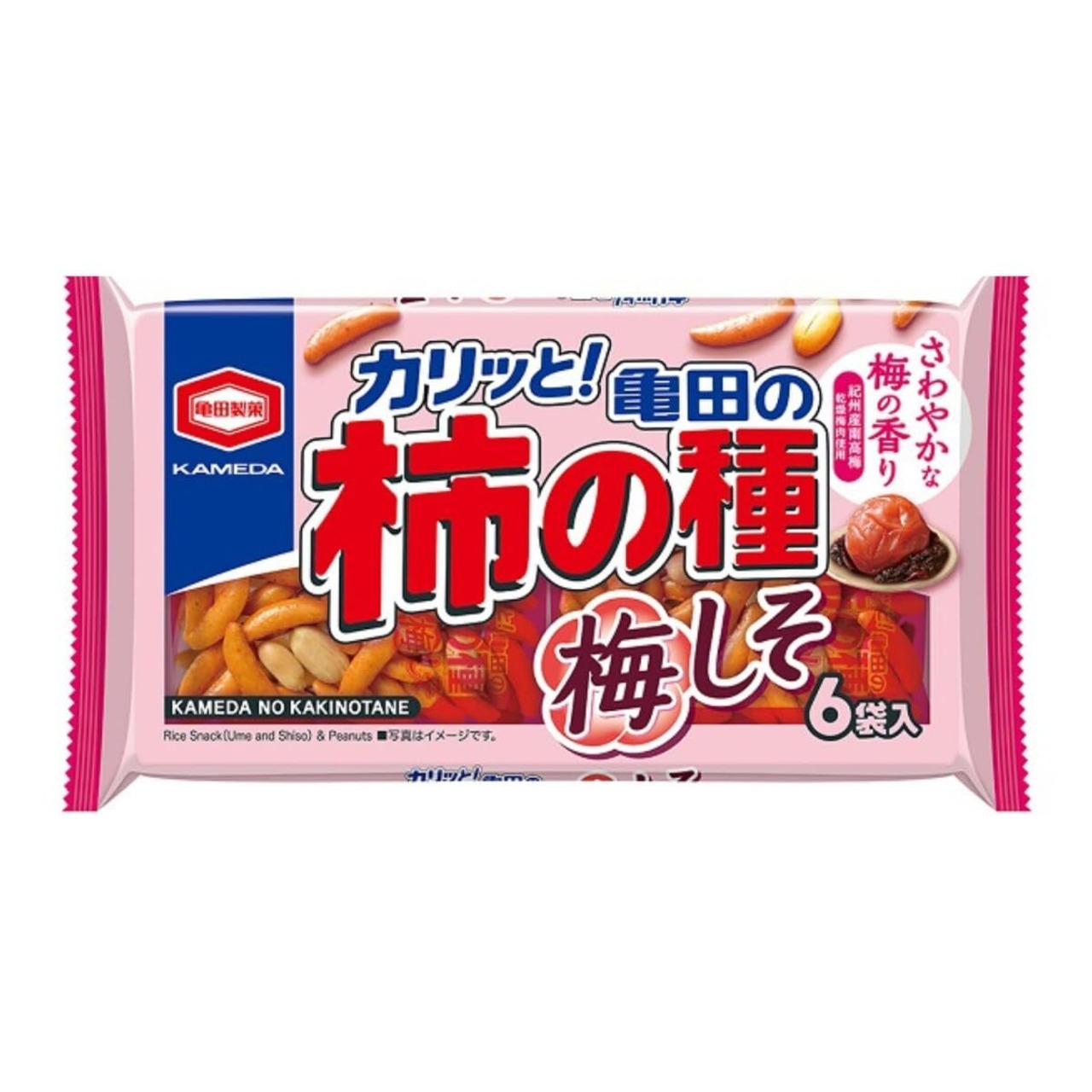 【亀田の柿の種 梅しそ】◆原材料:米粉(うるち米(国産))、でん粉、ピーナッツ(ピーナッツ、植物油脂、食塩)、しょうゆ、梅しそシーズニング、砂糖、魚介エキス調味料、たん白加水分解物、こんぶエキス、乾燥梅肉/調味料(アミノ酸等)、加工でん粉、酸味料、ソルビトール、香料、着色料(カラメル、パプリカ色素、ムラサキトウモロコシ色素)、甘味料(スクラロース、ネオテーム)、香辛料抽出物、乳化剤、(一部に小麦・卵・落花生・大豆・鶏肉・豚肉を含む) ◆内容量:164g(食べきりサイズ 小袋6P)