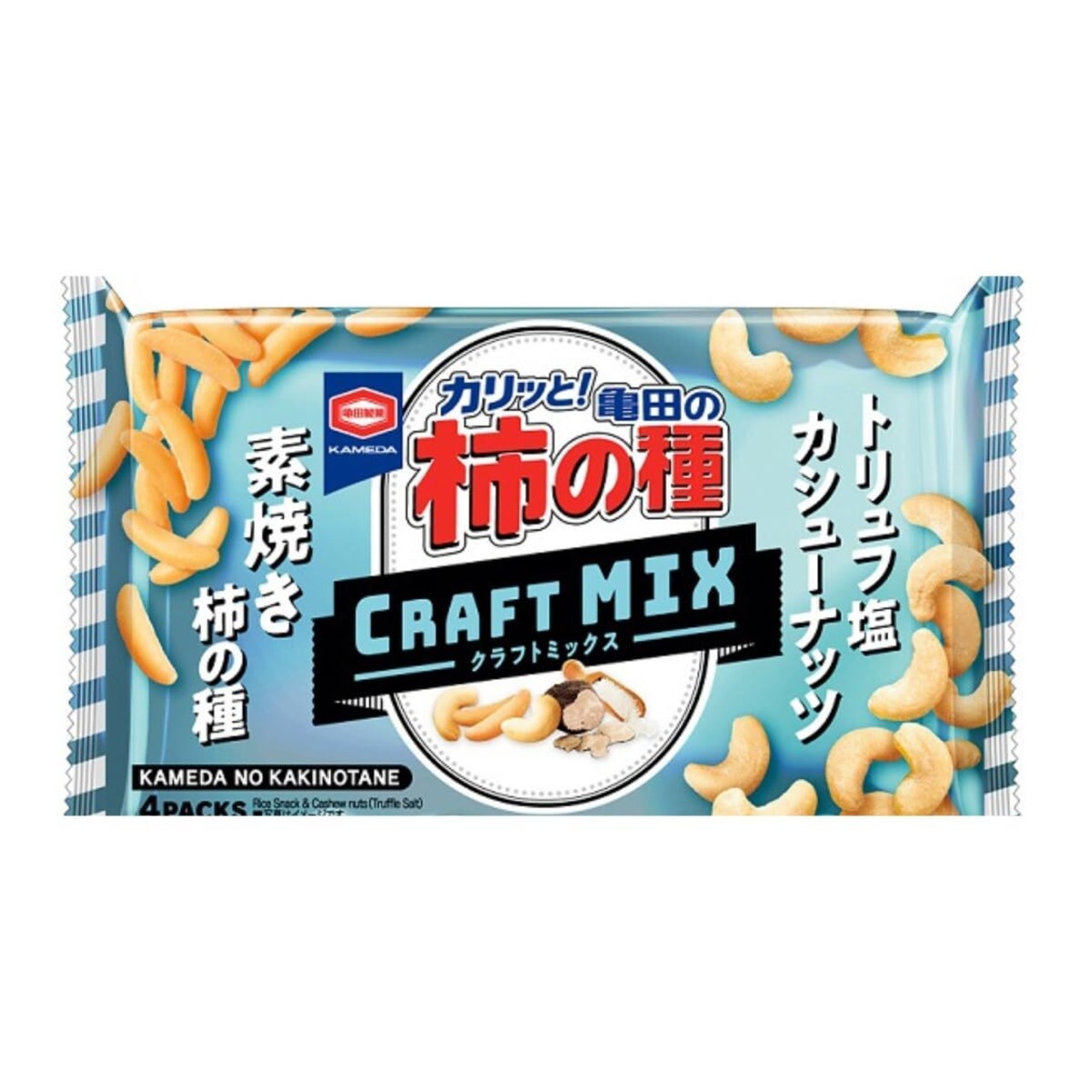 【亀田の柿の種 クラフトMIXカシューナッツ】原材料:カシューナッツ加工品(カシューナッツ(インド産)、食塩、植物油脂、ぶどう糖、マッシュルームエキスパウダー、たん白加水分解物、しいたけエキスパウダー、香辛料、オニオンパウダー、酵母エキスパウダー、トリュフ塩)、米粉(うるち米(国産))、でん粉/調味料(アミノ酸等)、香料、植物レシチン、香辛料抽出物、(一部に小麦・カシューナッツ・大豆を含む) ◆内容量:70g(食べきりサイズ 小袋4P)
