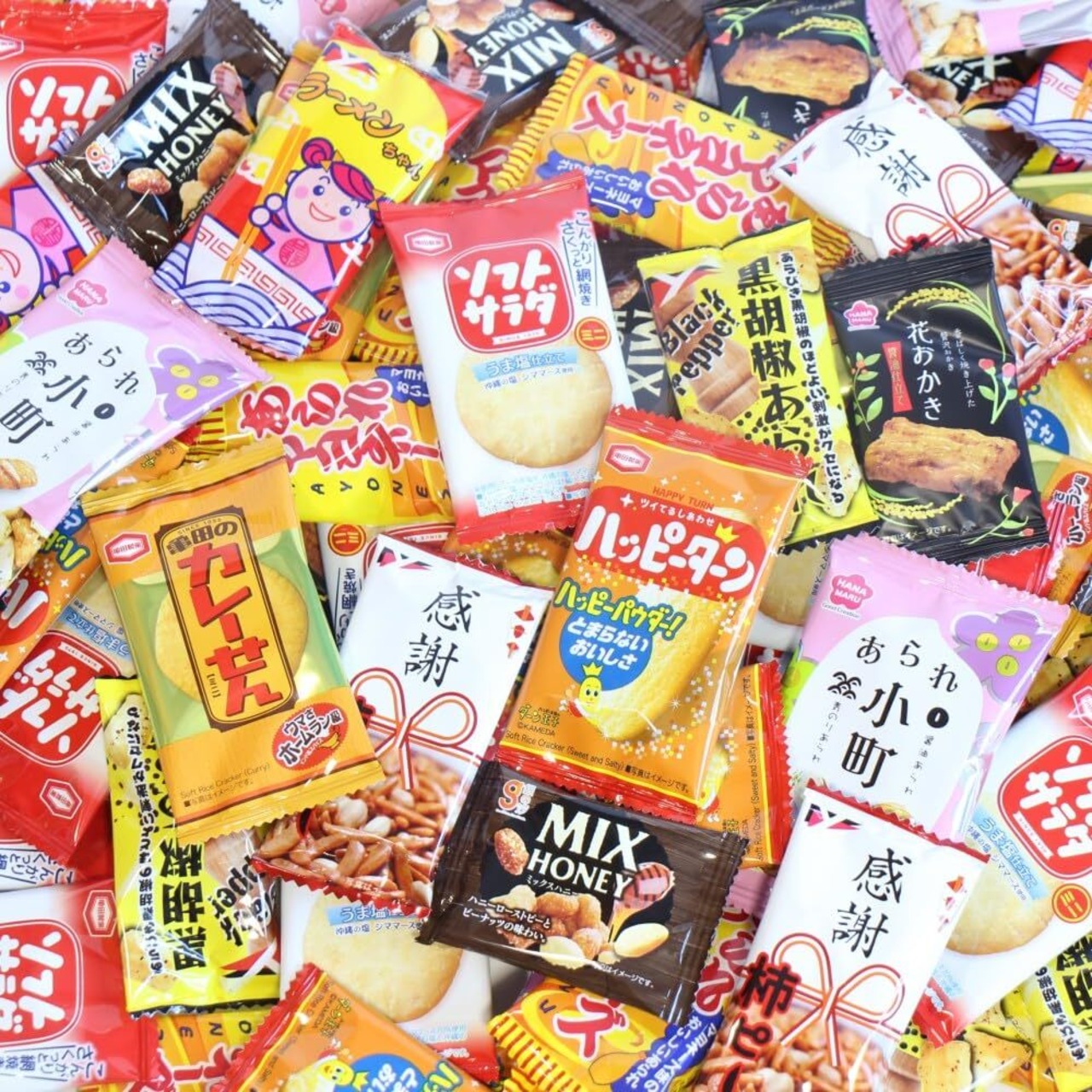 ※セット内容例: 亀田製菓 亀田のカレーせんミニ旨口 1枚×10コ、亀田製菓 ソフトサラダミニ 1枚×10コ、 亀田製菓 ハッピーターン 1枚×10コ、 ヤスイフーズ 感謝柿ピー 6g×10コ、 ヤスイフーズ あられマヨネーズ 5g×10コ、 ヤスイフーズ ラーメンちゃん 6g×10コ、 ヤスイフーズ 黒胡椒あられ 5g×10コ、 銀の汐 ミックスハニー7gx10コ、 花まるクリエーション 花おかき1枚x10コ、花まるクリエーション あられ小町6g×10コ