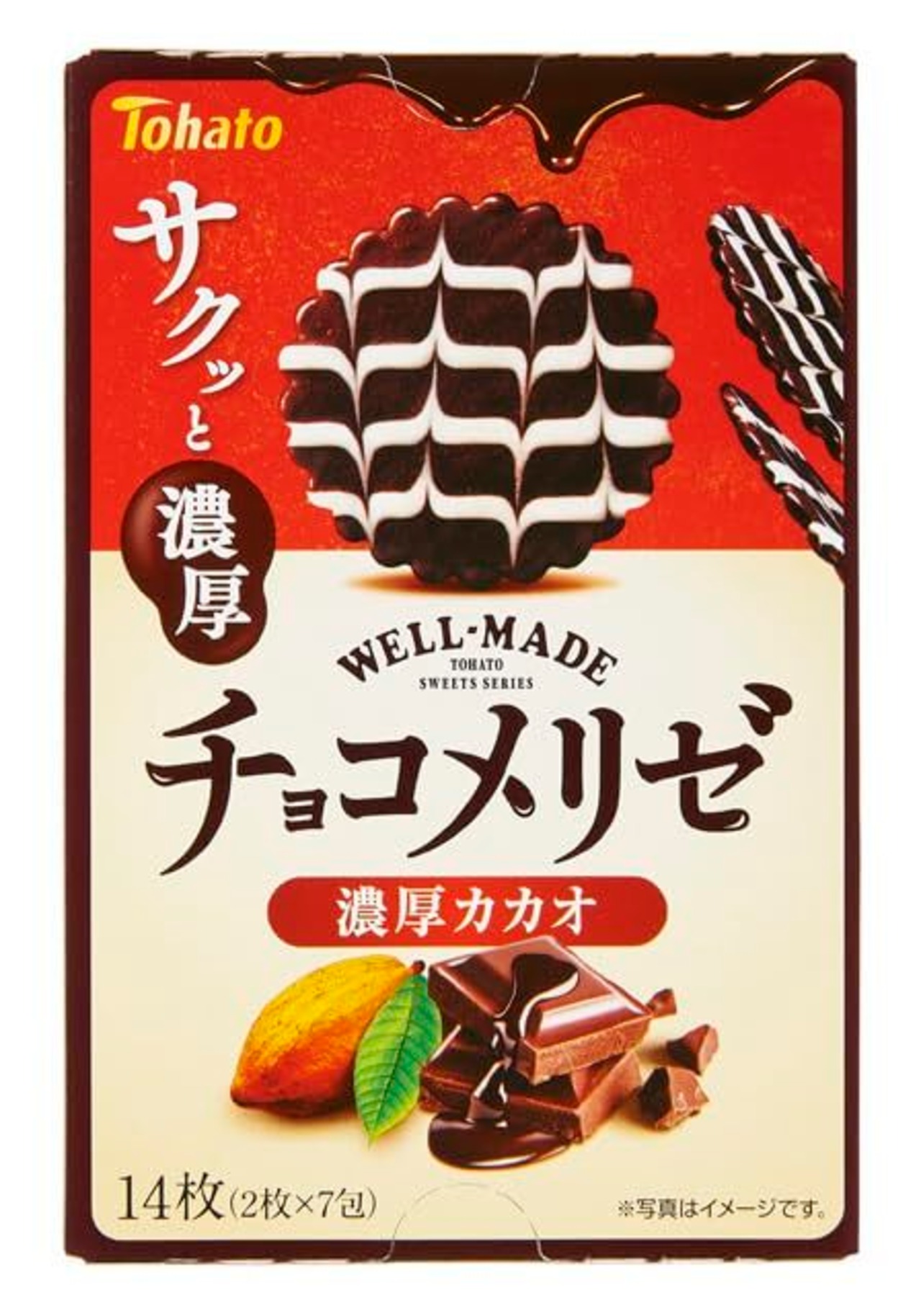 ひと手間加えた、上出来スイーツシリーズ「ウェルメイド」。チョコメリゼ 濃厚カカオはカカオマスを加えたチョコで、薄焼きココアビスケットをフルコート。焼きチョコ製法で溶けにくいチョココートビスケットです。生地中に新たに香辛料(アニスパウダー)を加え、華やかなカカオの味わいに仕上げました。