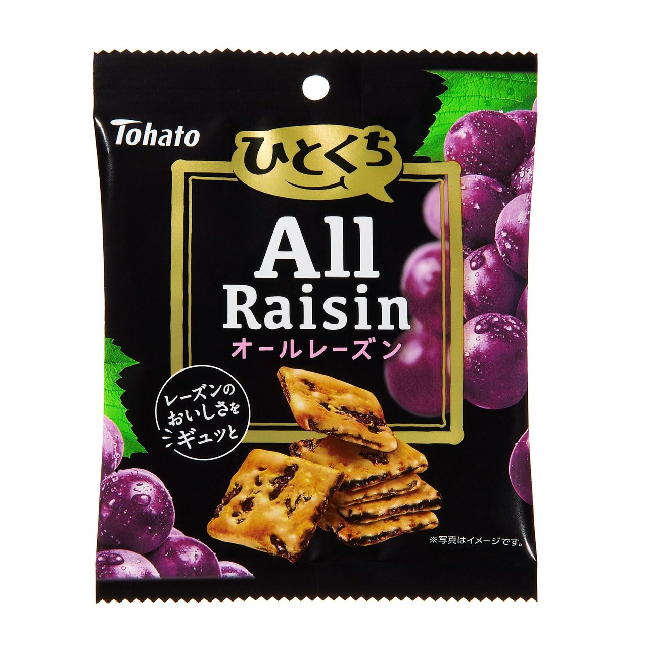 クッキー生地とクッキー生地の間に、ぶどうを皮ごと干したレーズンをたっぷり挟み込み、ギュッと薄く延ばして焼き上げた、ひとくちサイズのオールレーズンです。レーズンの甘さがおいしさを引き立てています。いつでもどこでもカバンから取り出し、手軽に食べられる包装形態です。