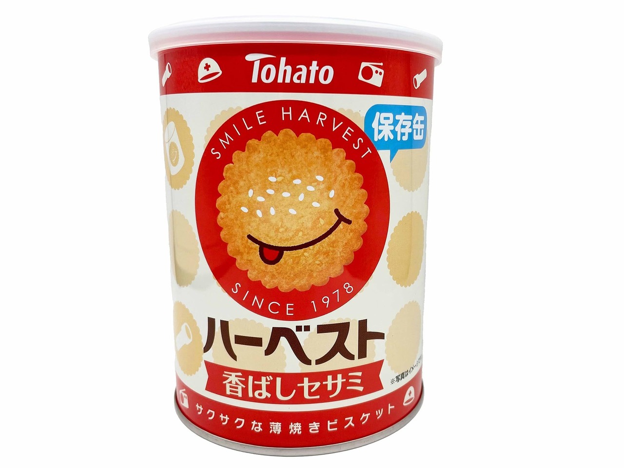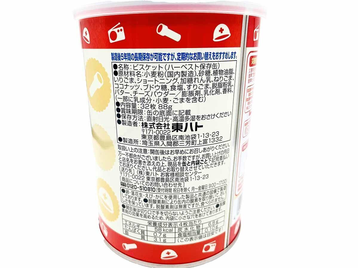 商品説明 ミレービスケット保存缶:原材料 小麦粉、砂糖、ショートニング、ぶどう糖、食塩/膨張剤、乳化剤(大豆由来)(原材料の一部に大豆を含む)製造国 日本 ●高知県民ならだれもが知っているビスケットです。長期保存が可能なノンフライの高知県防災関連製品認定商品です。おじいちゃん、おばあちゃん、お父さん、お母さんも食べたミレーは、まじめなおかしとして有名です。素朴ながらクセになる味わいのビスケット。●栄養成分表示(100g当り) エネルギー(430kcal)、たんぱく質(7.1g)、脂質(8.5g)、炭水化物(81.6g)【食塩相当量 0.5g】 ご利用例そのまま美味しくお召し上り頂けます。コーヒーや紅茶のお供に、お子様のおやつにも大変喜ばれております。満腹感も高く非常食としてオススメの商品でございます。 東ハト ハーベスト 香ばしセサミ 保存缶:原材料 小麦粉、植物油脂、砂糖、いりごま(白ごま、金ごま)、ショートニング、加糖れん乳 ココナッツ、すりごま、ブドウ糖、マーガリン、食塩、たんぱく質濃縮ホエイパウダー(乳製品)、ドロマイト(炭酸カルシウムマグネシウム含有物)、チーズパウダー、膨脹剤、調味料(アミノ酸等)、香料、乳化剤、(原材料の一部に大豆を含む)