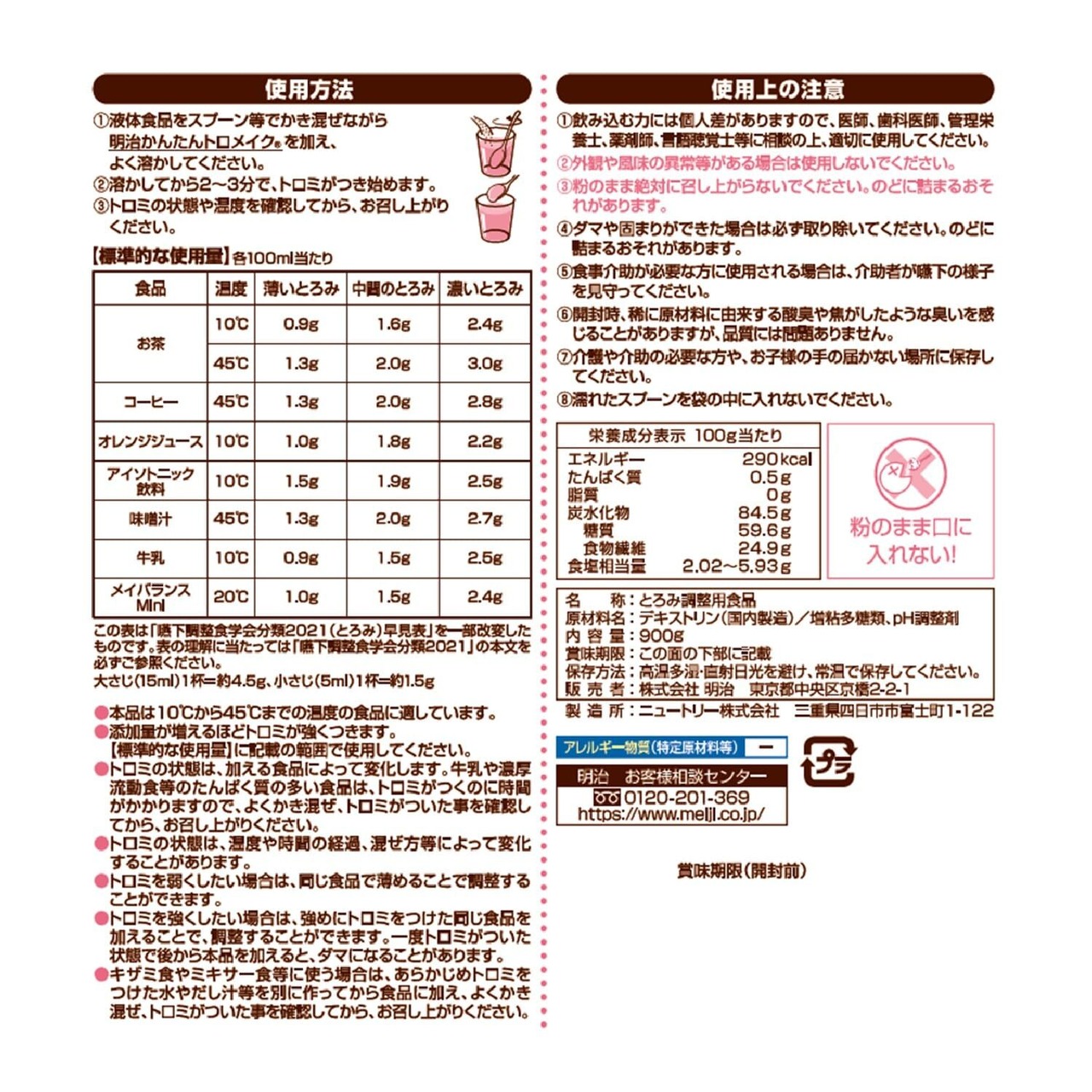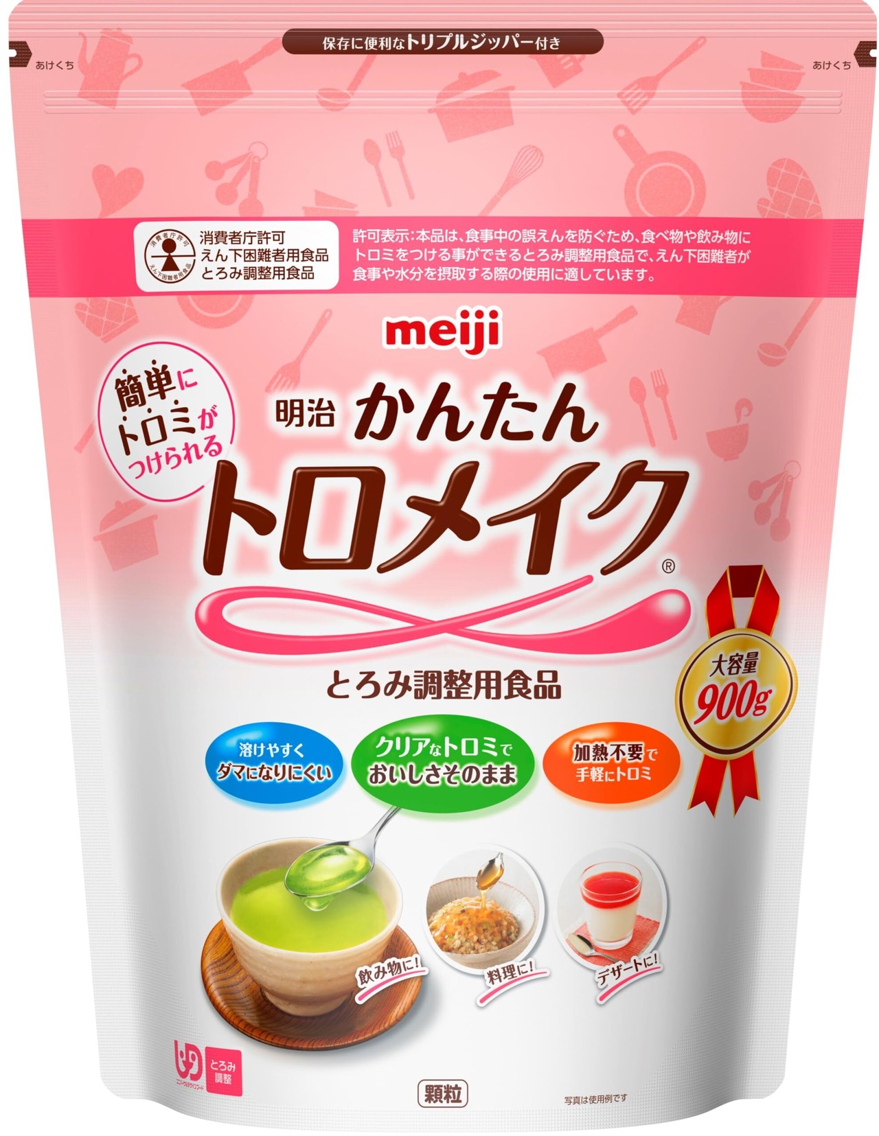 明治おうちで簡単トロメイクは、食品本来の「味・色・香り」をそこなわず、おいしさそのまま、誰でも簡単にすばやく溶かすことができる「とろみ調整食品」です。