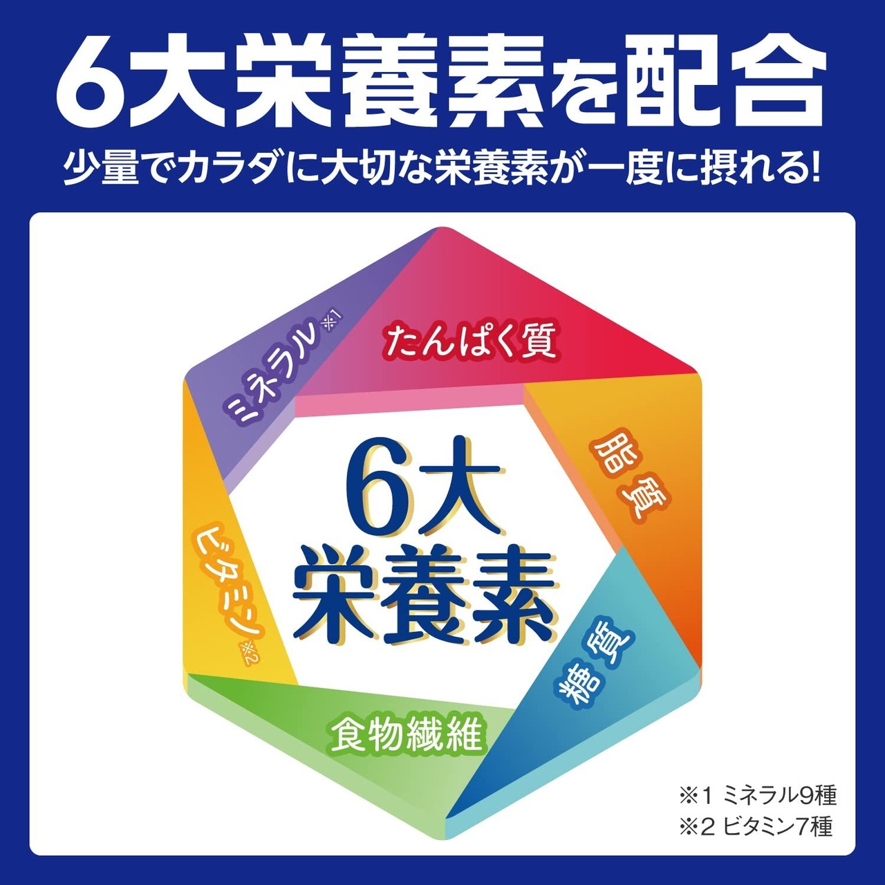 体に必要な6大栄養素(たんぱく質、脂質、糖質、食物繊維、ビタミン、ミネラル)をバランスよく配合