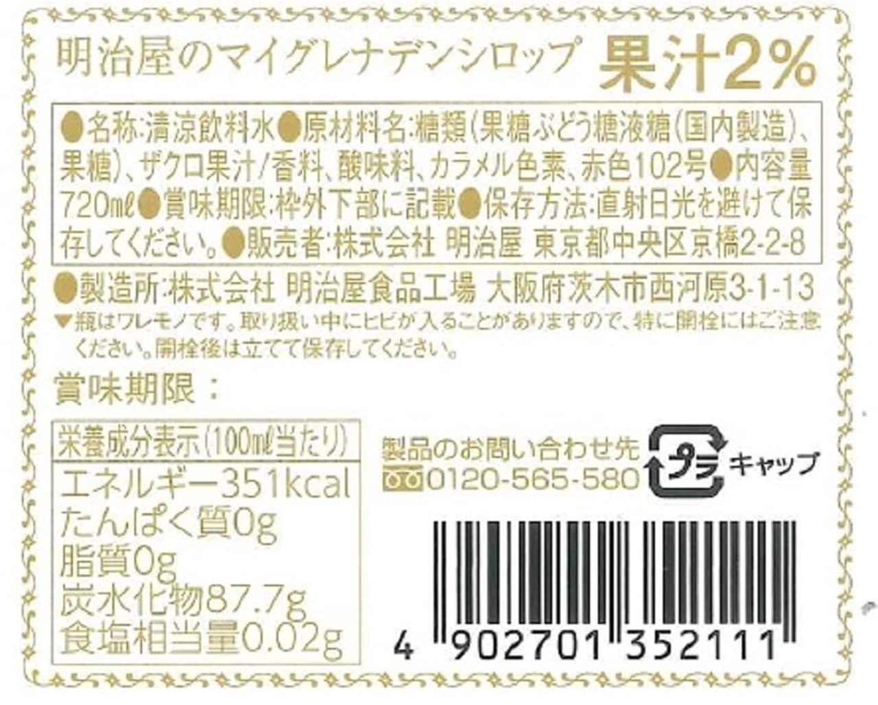 明治屋のカクテル材料シリーズです。甘酸っぱいざくろ風味のシロップです。「テキーラサンライズ」や「ミリオンダラー」などのカクテルを彩ります。果汁2%。