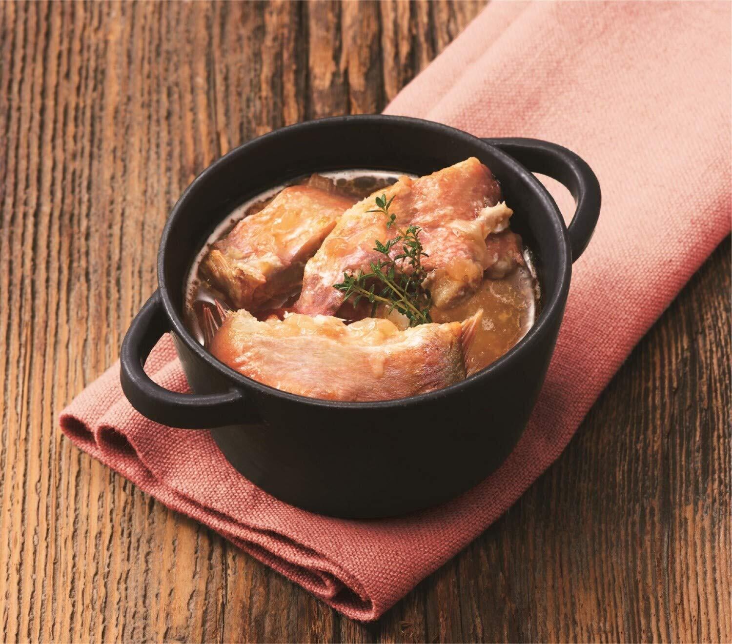 開けるだけで一品料理が楽しめるグルメな缶詰です。天然の金目鯛を白ワインやハーブを加えて煮込み、魚介の旨みが凝縮したブイヤベース風に仕上げました。