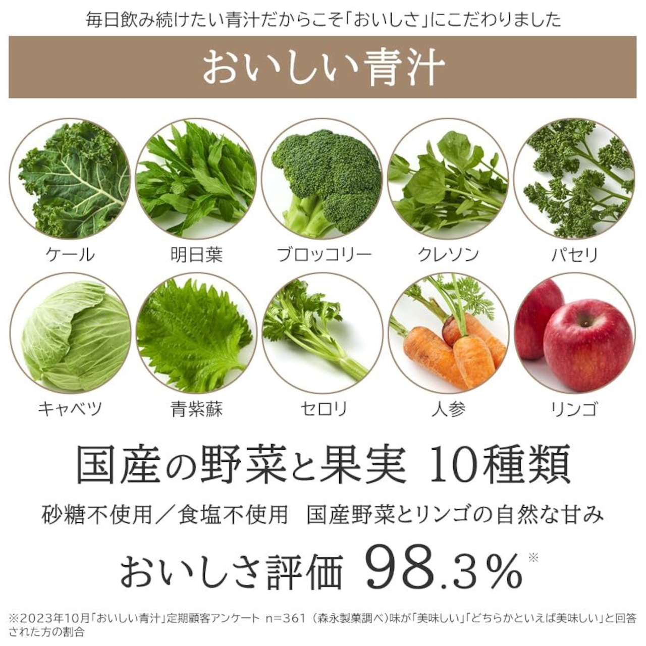 10種類の野菜と果実はすべて国産を使用、おいしさと栄養をぎゅっと1本に閉じ込めました。 「おいしい青汁」は、ケール、明日葉、ブロッコリー、クレソン、パセリ、キャベツ、青紫蘇、セロリ、人参、りんごを使用しています。砂糖・食塩は使用していません。