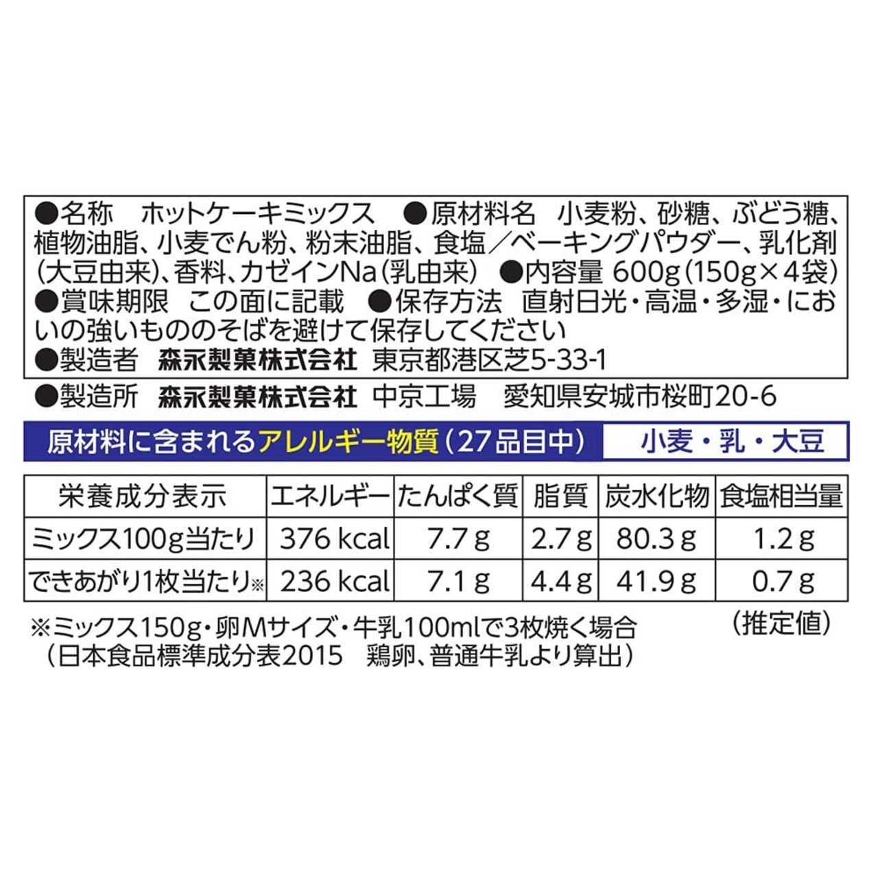 ミックス100g当たり:エネルギー375kcal、たんぱく質7.2g、脂質2.7g、炭水化物80.4g、食塩相当量1.3g できあがり1枚当たり※1:エネルギー235kcal、たんぱく質6.9g、脂質4.4g、炭水化物41.9g、食塩相当量0.8g ※1 牛乳使用 ミックス150gで3枚焼く場合(卵Mサイズ・乳脂肪分3.8%牛乳使用) できあがり1枚当たり※2:エネルギー212kcal、たんぱく質5.7g、脂質3.1g、炭水化物40.3g、食塩相当量0.7g ※2 水使用 ミックス150gで3枚焼く場合(卵Mサイズ使用)