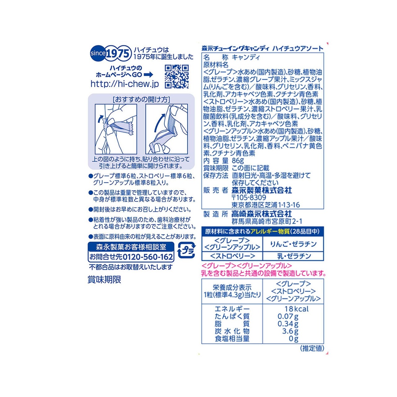<グレープ>水あめ(国内製造)、砂糖、植物油脂、ゼラチン、濃縮グレープ果汁、ミックスジャム(りんごを含む )/酸味料、グリセリン、香料、乳化剤、アカキャベツ色素、クチナシ青色素 <ストロベリー>水あめ(国内製造)、砂糖、植物油脂、ゼラチン、濃縮ストロベリー果汁、乳酸菌飲料(乳成分を 含む)/酸味料、グリセリン、香料、乳化剤、アカキャベツ色素 <グリーンアップル>水あめ(国内製造)、砂糖、植物油脂、ゼラチン、濃縮アップル果汁/酸味料、グリセリン、 乳化剤、香料、ベニバナ黄色素、クチナシ青色素