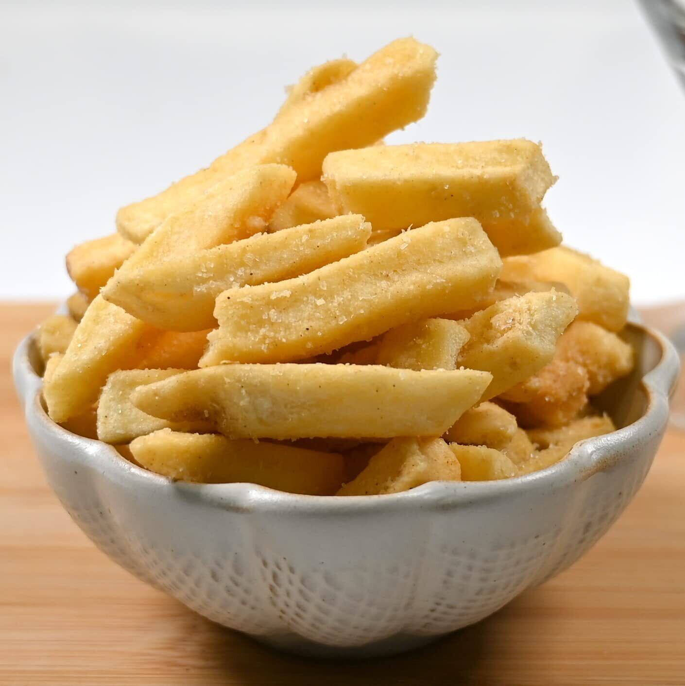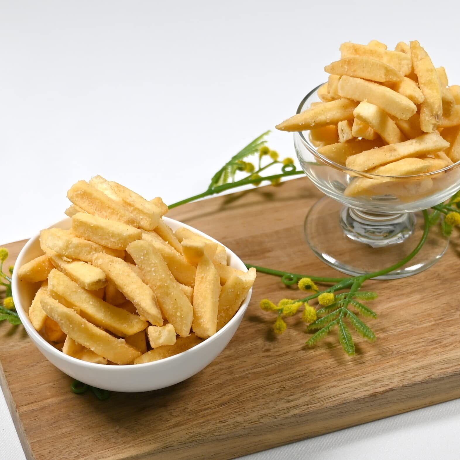 【スティック型で食べやすい】サクサク軽い食感のポテトスナックは、スティック型でポテチなどと比べても口元や手が汚れにくいスナック菓子です。他商品のフライドポテト(ふらいどポテト)に比べても軽い食感で、じゃがいもの焦げや皮等の固い部分が少ないので、気軽にパクパク食べ進められます。