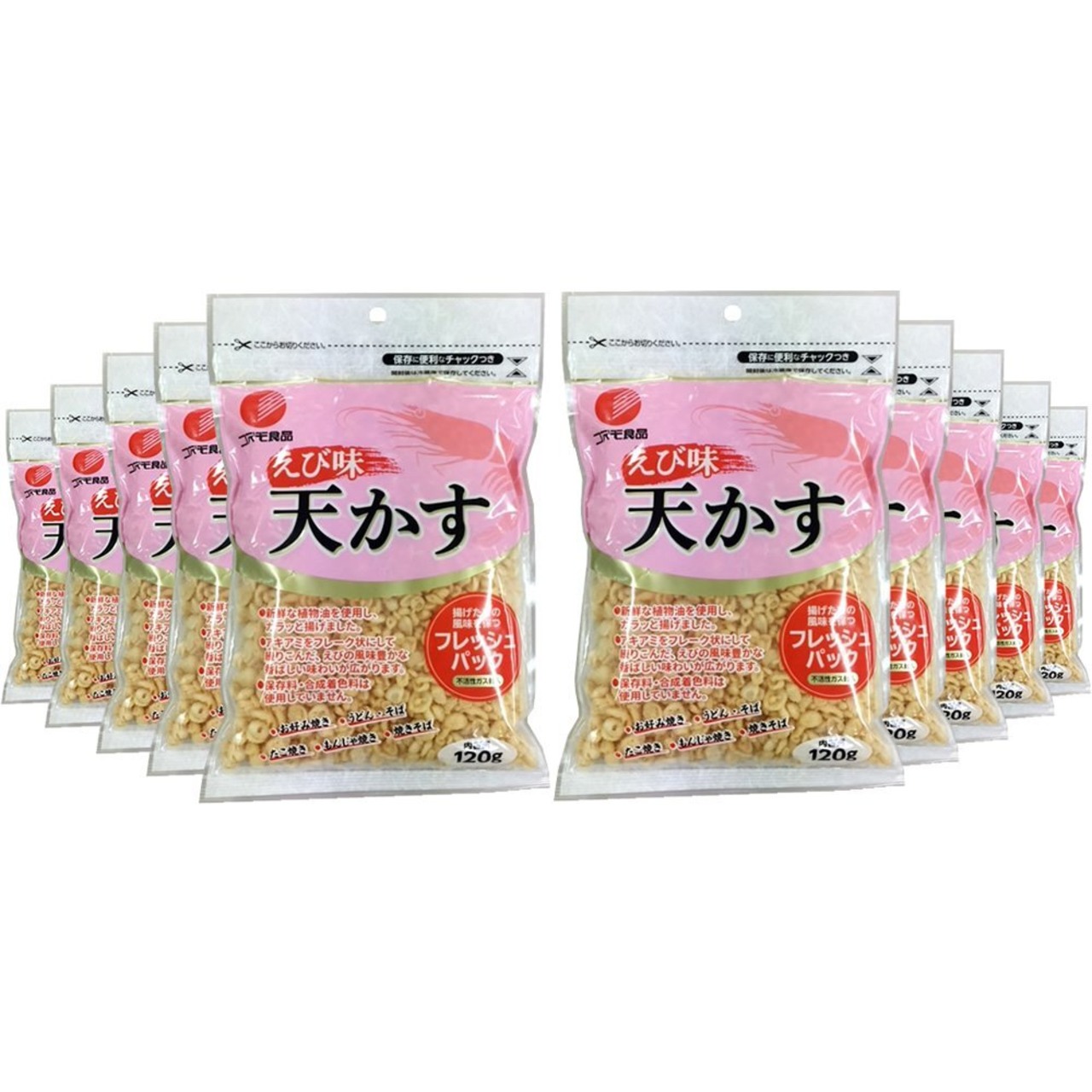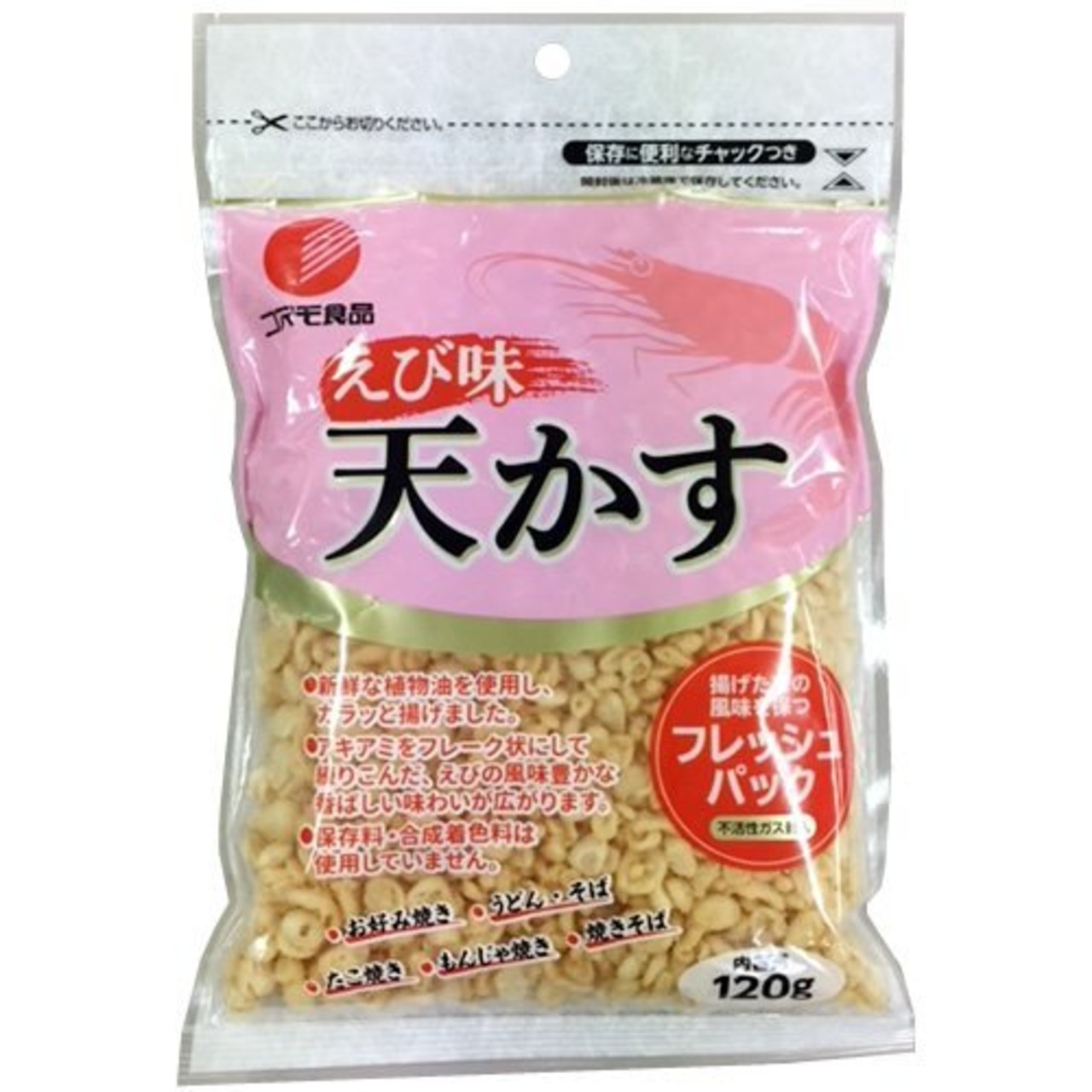 海老の風味を活かした天かすです。粗めに粉砕したアキアミを天かすに練り込んで揚げており、また味付けにも海老醤を使用するなど海老の風味豊かな天かすに仕上げています。不活性ガスを封入して美味しさを長くキープしており、チャック付き袋を使用して使いやすい120gタイプの商品です。