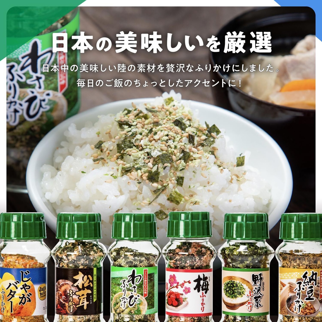 【厳選 みなり 大地の恵み ふりかけ 6種セット】じゃがバター 松茸 わざび 梅 野沢菜 納豆 各65~90g 国産 大容量 ご飯のお供 保存食 業務用 簡単おかず お弁当 非常食