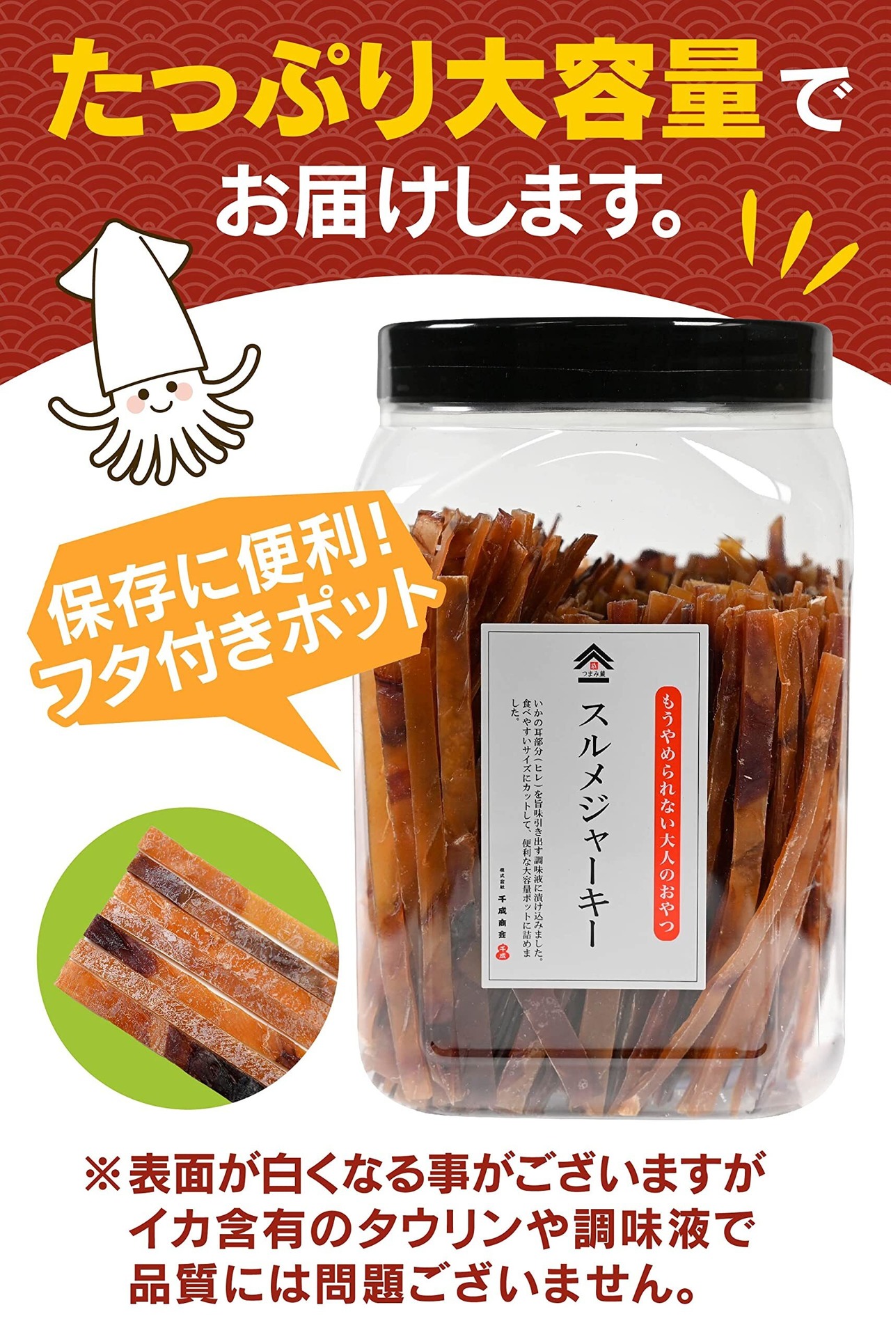 【業務用でもっとお得に!】するめジャーキーがたっぷり大満足量入った、業務用でとってもお得にお届け!大容量でもポット容器に入っていますので、保管もしやすく食べやすいするめジャーキーとなっています。お酒のおつまみはもちろん、お子様のおやつとしても、ご家族皆さまで毎日気軽にお楽しみいただけます。