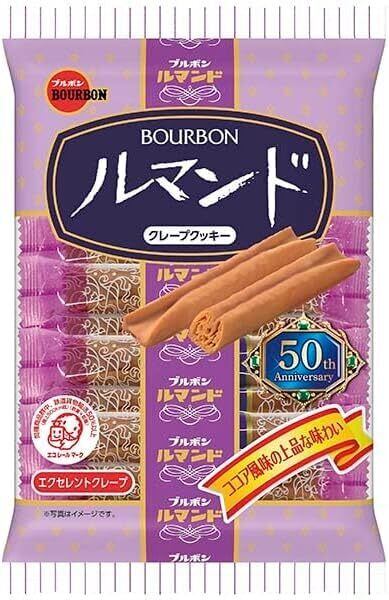 【ルマンド】 商品紹介 サックリとした軽い歯ざわりの食感と、マイルドなココアクリームがマッチしたクレープクッキーです。長年愛され続けるロングセラー商品ならではの安心感があります。ブルボン独自の製造技術で量産化したオリジナル性の高い商品です。1本つづ個包装になっていますので様々な食シーンでお楽しみいただけます。 原材料・成分 小麦粉(国内製造)、砂糖、植物油脂、マーガリン(乳成分を含む)、全粉乳、脱脂粉乳、液全卵、クリーミングパウダー(乳成分を含む)、マルトース、水飴、ココアパウダー、乳糖、ホエイパウダー(乳成分を含む)、食塩、洋酒 / 乳化剤(大豆由来)、カゼインナトリウム(乳由来)、香料(乳由来)、膨脹剤、着色料(カロテン)