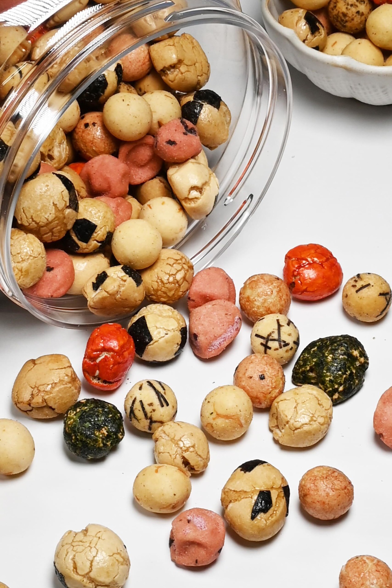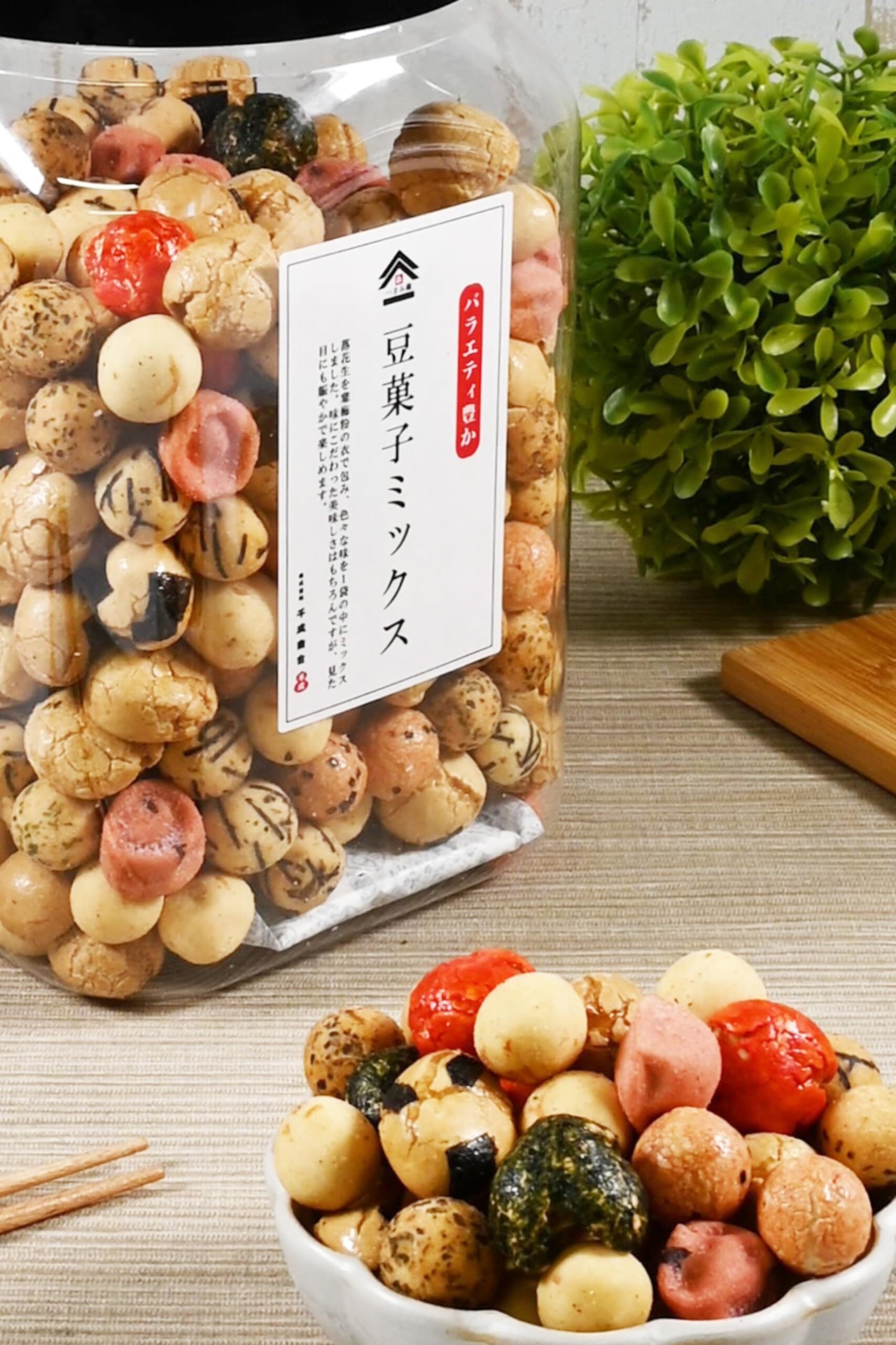 【原材料】豆菓子ミックス:落花生(南アフリカ)、寒梅粉、小麦粉、砂糖、澱粉、食塩、海老粉、醤油(大豆・小麦を含む)、馬鈴薯澱粉、刻海苔、青のり、切いか、刻み焼き海苔、植物油脂/調味料(アミノ酸)、カラメル色素、着色料(赤3号、赤102号、赤106号、黄4号、黄5号)、膨張剤 梅干豆:落花生(南アフリカ)、小麦粉、砂糖、澱粉、寒梅粉、植物油脂、しそ、梅肉パウダー、食塩/紅麹色素、酸味料(クエン酸)、香料