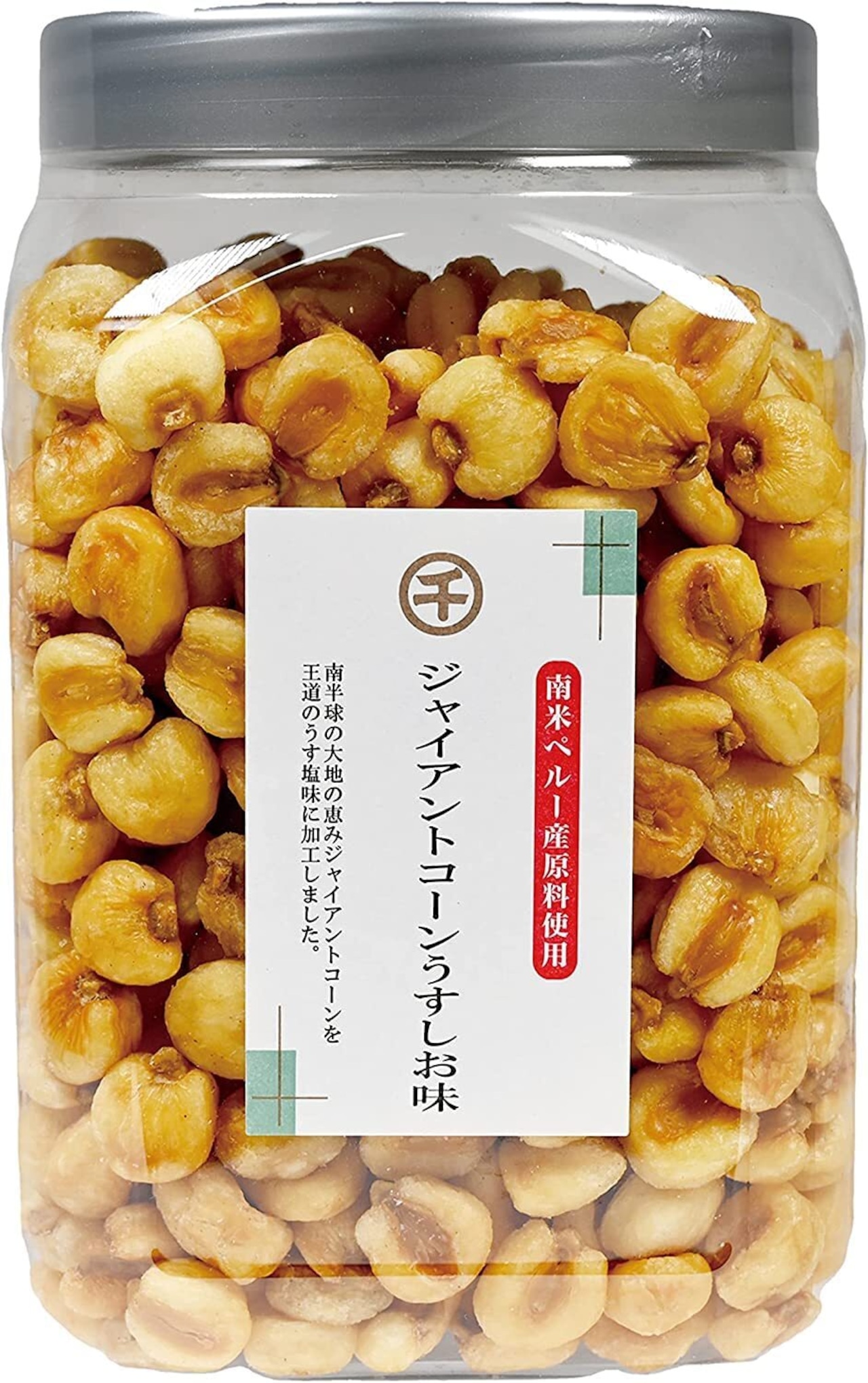 【ジャイアントコーンとは?】ジャイアントコーンとは、南米ペルーで栽培されている植物。トウモロコシより約2倍の種子の大きさで白いのが特徴です。ごく限られた地域でしか栽培できず、遺伝子組み換えができないといわれている珍しい品種です。そんなジャイアントコーンを揚げて味付けした、美味しい業務用のお菓子です。