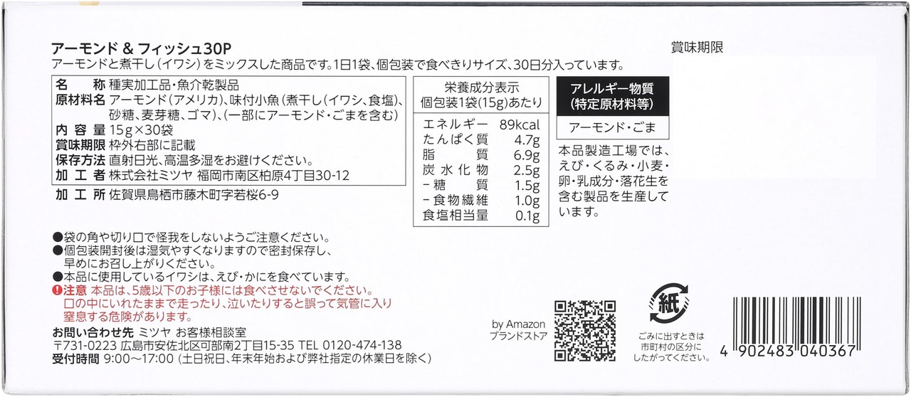 原材料:アーモンド(米国)、味付小魚(煮干し(イワシ、食塩)、砂糖、麦芽糖、ごま)、(一部にアーモンド・ごまを含む) 栄養成分表示個包装1袋(15g)あたり:エネルギー89kcal たんぱく質4.7g 脂質6.9g 炭水化物2.5g 糖質1.5g 食物繊維1.0g 食塩相当量0.1g