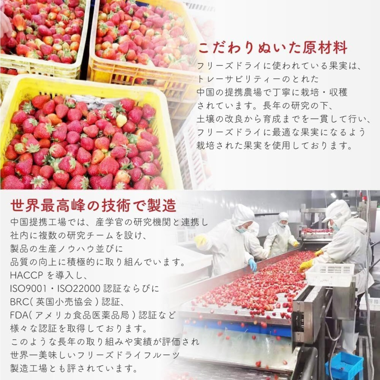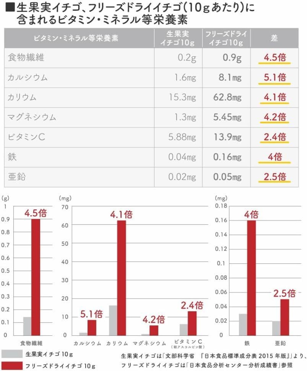 【美味しさと栄養がぎゅっと詰まったいちご】イチゴの果肉をそのままフリーズドライにしました。 果肉のビタミン・ミネラル等の栄養素が凝縮され、 生の状態と同じ量で比較すると食物繊維やカリウム、鉄、ビタミンCなどの栄養素が圧倒的に多くなります。