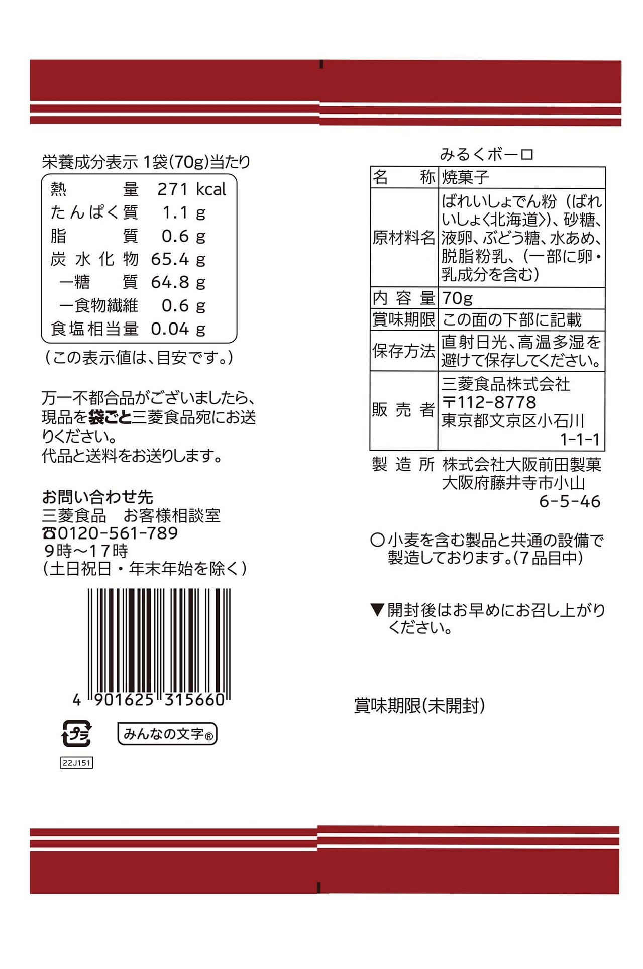 ばれいしょでん粉(ばれいしょ<北海道>)、砂糖、液卵、ぶどう糖、水あめ、脱脂粉乳、(一部に卵・乳成分を含む)