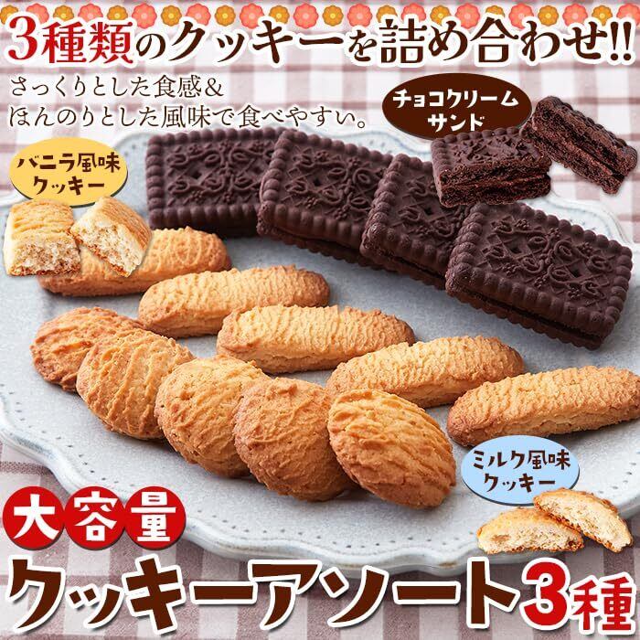 【3種類の味が楽しめる】バニラ風味クッキー・ミルク風味クッキー・チョコクリームサンドの3種類のクッキーの詰め合わせです。