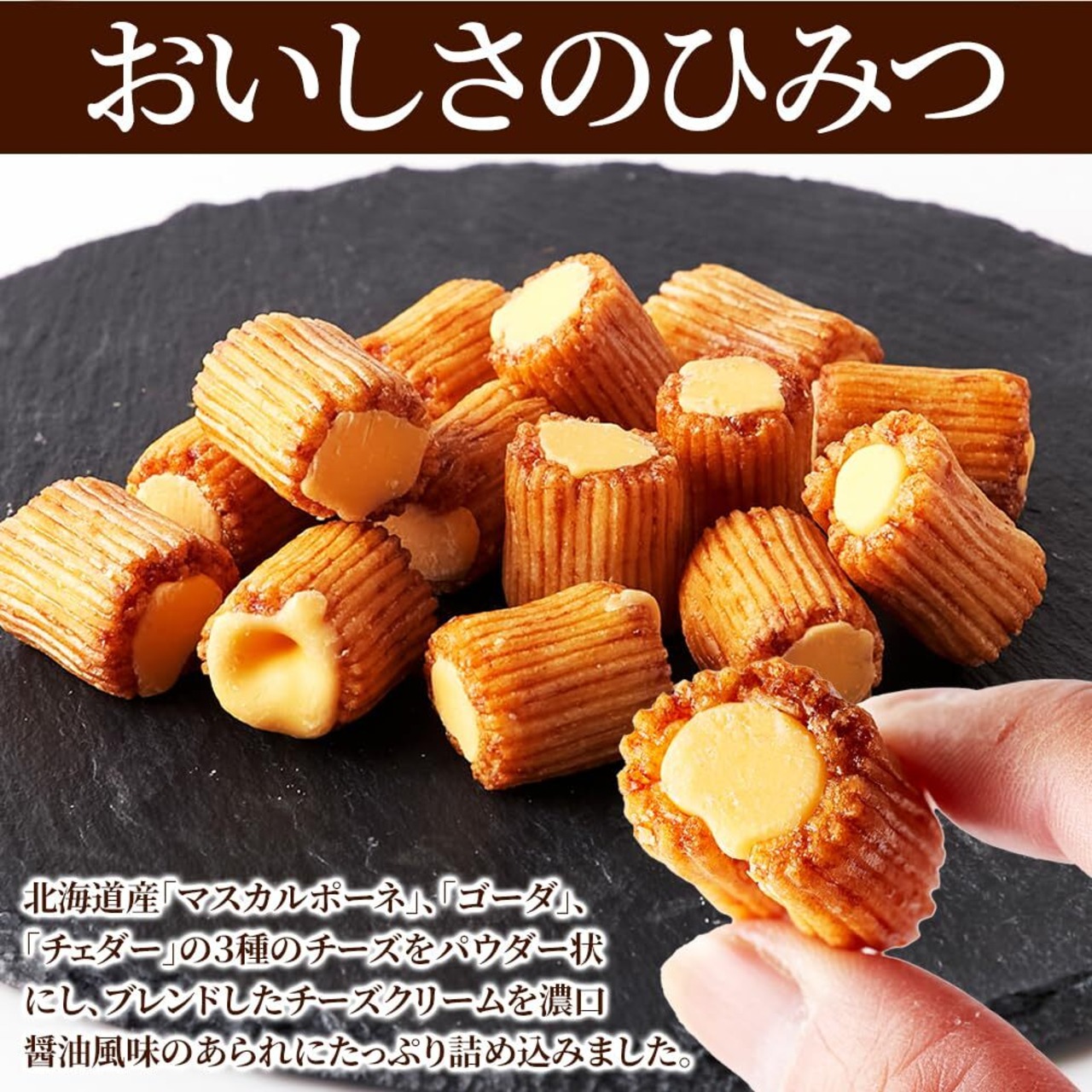 【おいしさのひみつ】北海道産「マスカルポーネ」、「ゴーダ」、「チェダー」の3種のチーズをパウダー状にし、ブレンドしたチーズクリームを濃口醤油風味のあられにたっぷり詰め込みました。