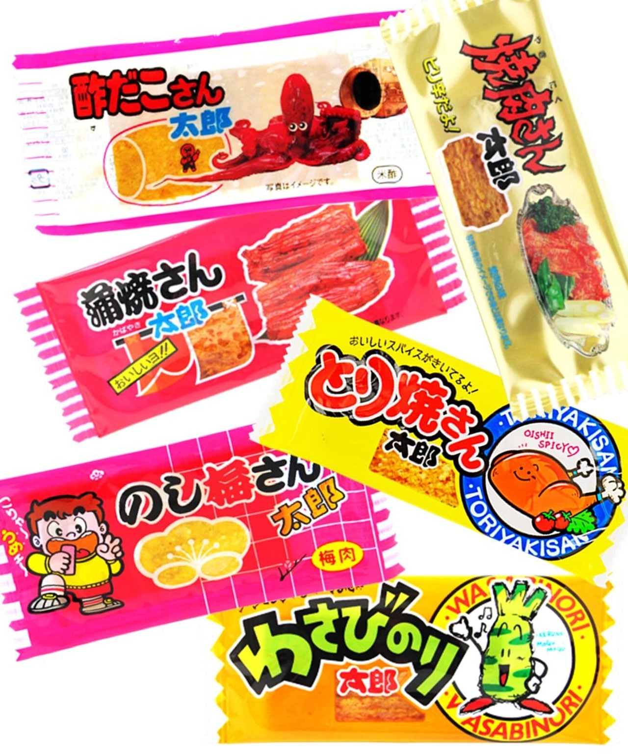 わさびのり太郎/蒲焼さん太郎/焼肉さん太郎/酢だこさん太郎/のし梅さん太郎/とり焼さん太郎 の詰め合わせのおつまみセットです。