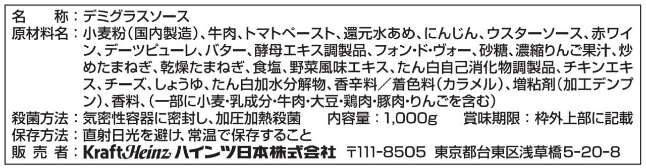 小麦粉(国内製造)、牛肉、トマトペースト、還元水あめ、にんじん、ウスターソース、赤ワイン、デーツピューレ、バター、酵母エキス調製品、フォン・ド・ヴォー、砂糖、濃縮りんご果汁、炒めたまねぎ、乾燥たまねぎ、食塩、野菜風味エキス、たん白自己消化物調製品、チキンエキス、チーズ、しょうゆ、たん白加水分解物、香辛料/着色料(カラメル)、増粘剤(加工デンプン)、香料、(一部に小麦・乳成分・牛肉・大豆・鶏肉・豚肉・りんごを含む)