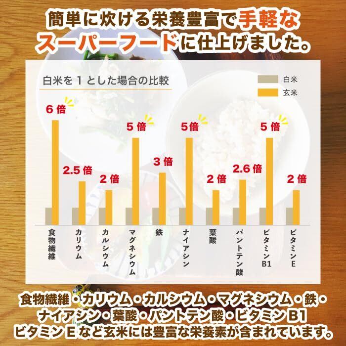 日々玄米生活 玄米 国産 3kg は、白米より栄養価の高い玄米を日々の食卓に並べる事はできないかと考え、手間を最小限に抑え、さらに主食として食べやすく、健康で負担のない玄米生活を送れるように作りました。 ※独自の製法により浸漬時間を短くして、美味しく炊き上げる事ができます。 (おすすめは、30分〜60分と白米を美味しく炊く時と同じ時間を、おすすめします) 原材料は、お米マイスターによる国産のその時期、玄米に最適なお米を選び使用しております。 ※通常の玄米より甘み・やわらかさなどがよくなり、食べやすくなっています。 ※通常玄米に比べGABA(ギャバ)が約2倍に増加しています。 ※「日々玄米生活」には、わずか1合でレタス450gの食物繊維が含まれています。 ◎美味しく食べる玄米の炊き方 お米を軽くすすいでください。 30分〜60分浸漬いただくとより美味しくいただけます。 ※水加減 1合につき、大さじ約4杯(60ml)の水で炊きます。