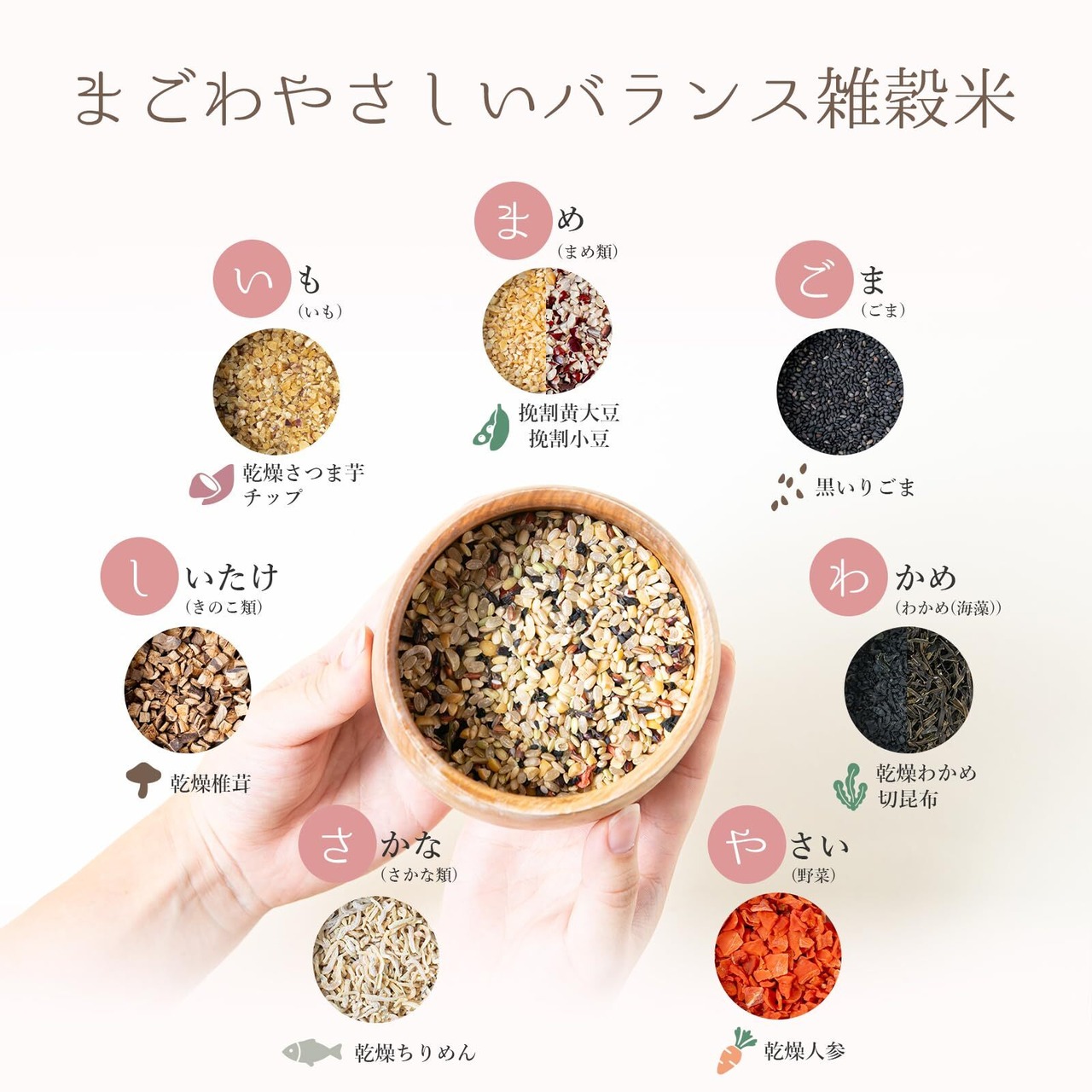 【まごわやさしい】 国産雑穀米5種と栄養豊かな食材9種を厳選配合。炊飯器でいつものお米と一緒に炊くだけの手軽さで、理想の食卓を実現します。