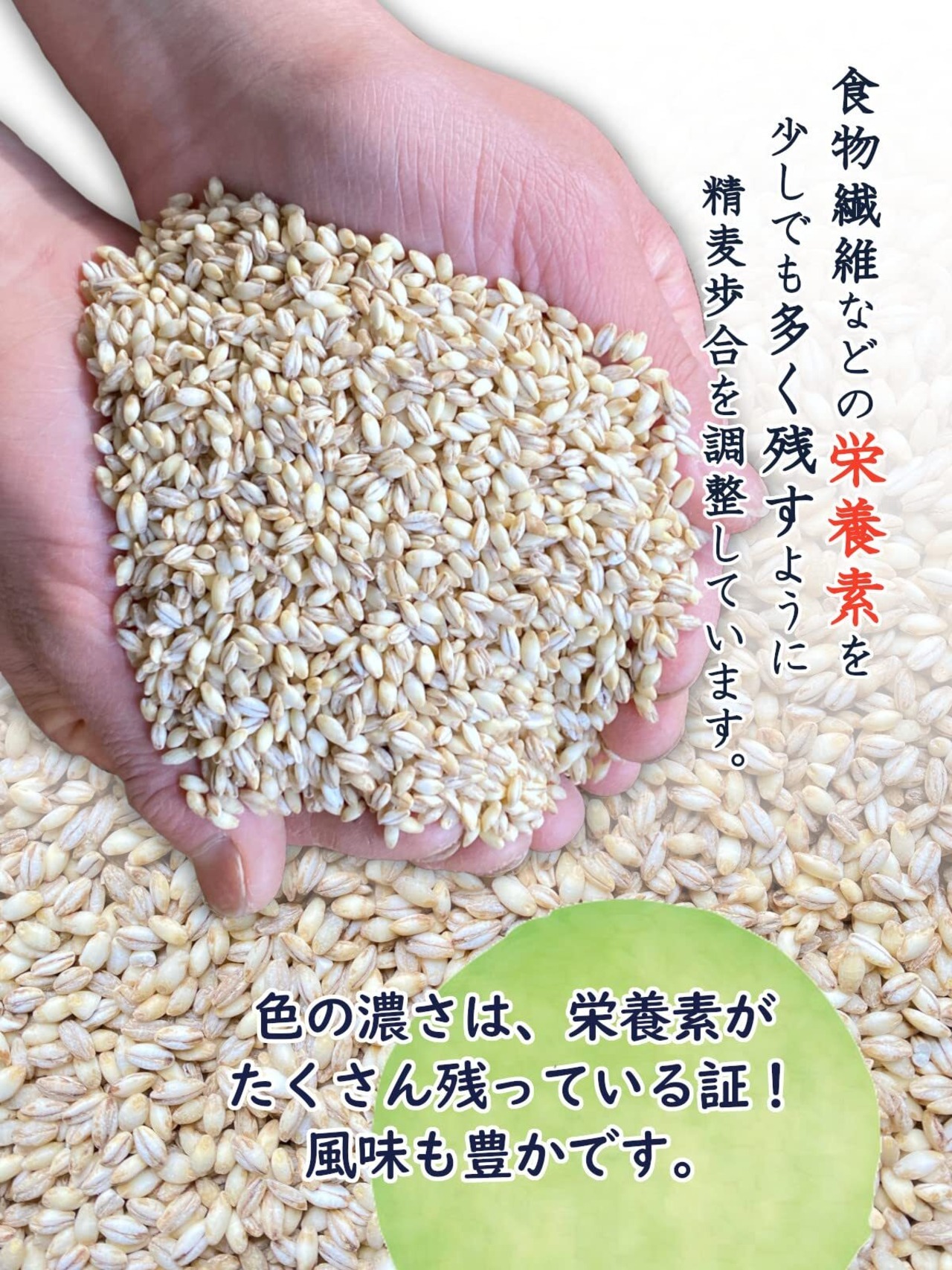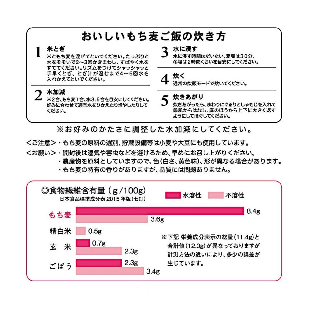 【もち麦の特徴】もち麦は粘りがありプチプチとした食感が特徴で、冷めても美味しくいただけます。食物繊維には「不溶性」と「水溶性」があり、もち麦には、どちらもバランスよく含まれています。栄養素(食物繊維など)を少しでも多く残したいと考え、精麦歩合を調整しているため色が濃いめですが、品質に問題はございません。