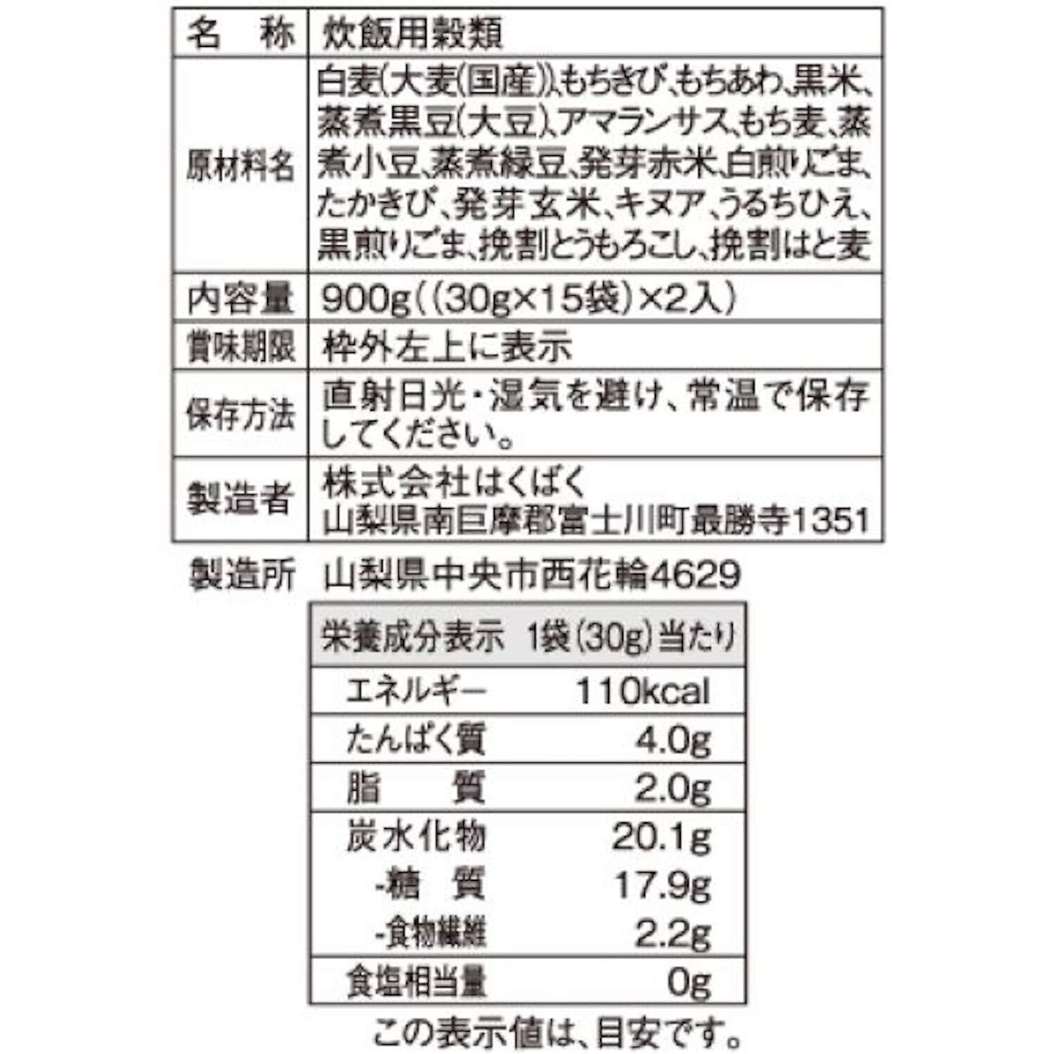 原材料:もちきび、もちあわ、大麦、黒米、黒豆(大豆)、アマランサス、小豆、緑豆、赤米、白ごま、たかきび、もち米、キヌア、発芽玄米、黒ごま、ひえ、とうもろこし、はと麦
