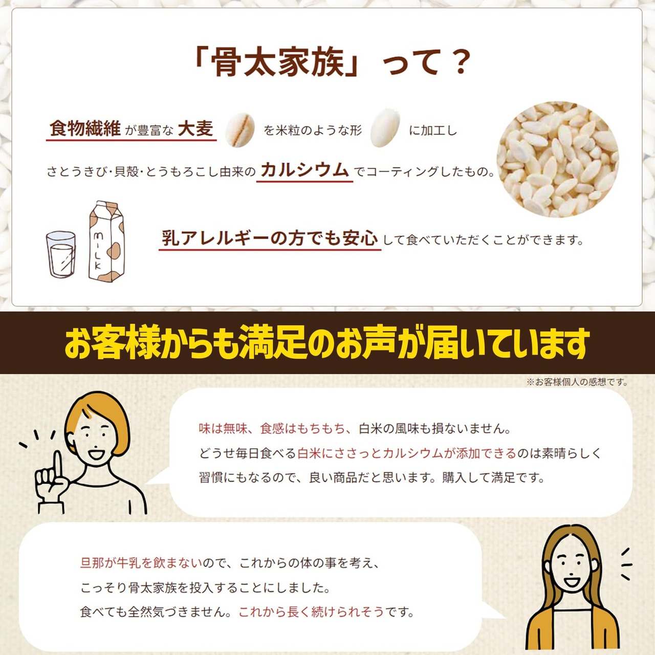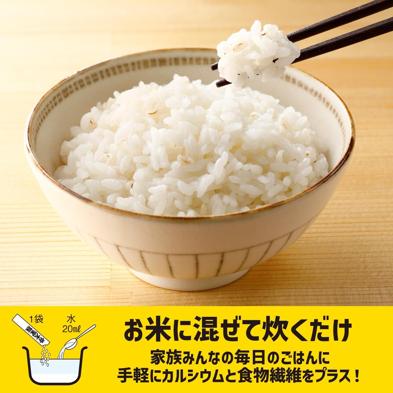穀物一筋のはくばくが誇るロングセラー商品です。健康維持に欠かせないカルシウムを、お米に混ぜて炊くだけで簡単に補給できる栄養機能食品です。サトウキビ由来、貝殻由来、とうもろこし由来のカルシウムを使用しているため、乳アレルギーの方でも安心してお使いいただけます。白米と混ぜて炊いても目立たないようにするため、大麦は「まるで白米」のような米粒状に加工しています。麦ごはん・雑穀ごはんが苦手なご家族でも食べやすく、白米の味・見た目を損なわないから続けやすいといったお声もいただいております。 10gずつ個包装になっているので計量の手間もありません。