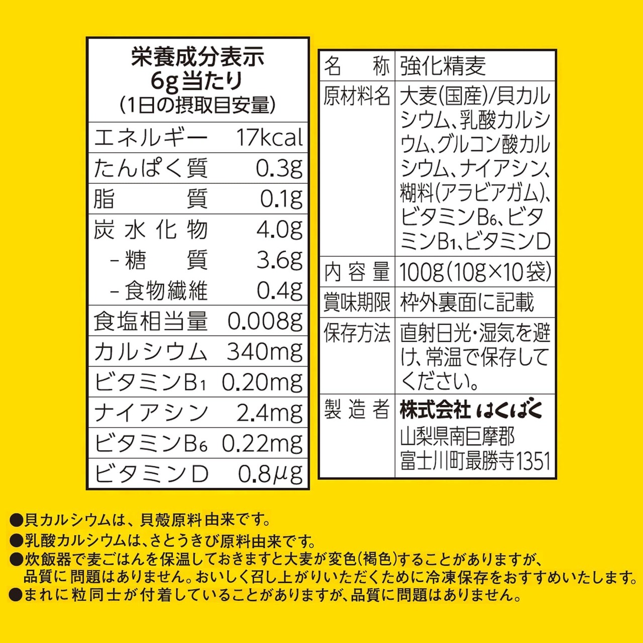 原材料:大麦(国産)/貝カルシウム、乳酸カルシウム、グルコン酸カルシウム、ナイアシン、糊料(アラビアガム)、ビタミンB6、ビタミンB1、ビタミンD