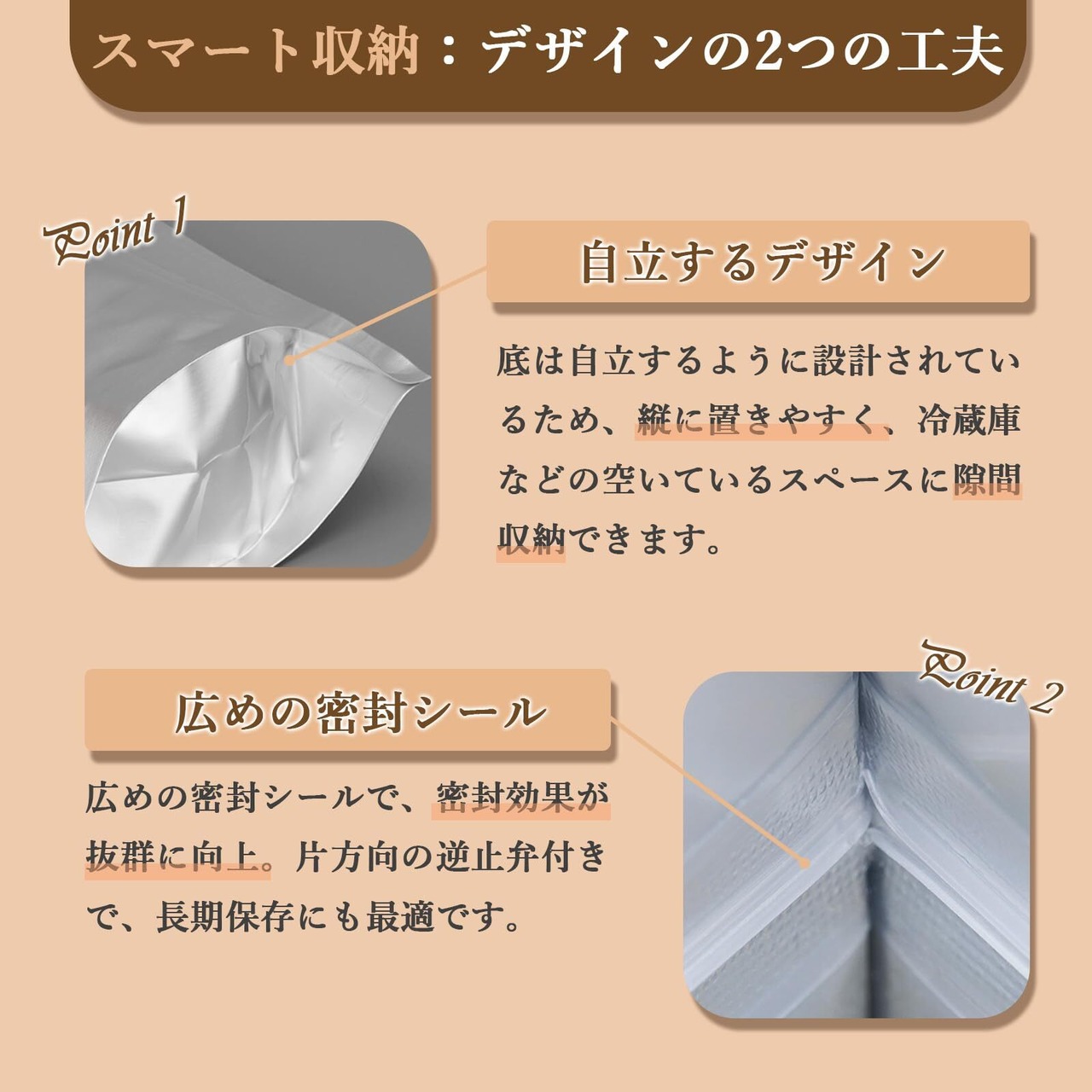 【食品級の3層構造アルミ箔袋】本製品は光・空気・臭いを遮断するアルミを挟んだ三層構造の「アルミ箔」保存袋です。一般的な「アルミ蒸着袋」は、蒸発させたアルミの粒子をフィルムに定着させて作られますが、アルミの密度が低く、容易に光が透過します。の製品は完全に遮光でき、フラッシュライトや懐中電灯でお確かめいただけます