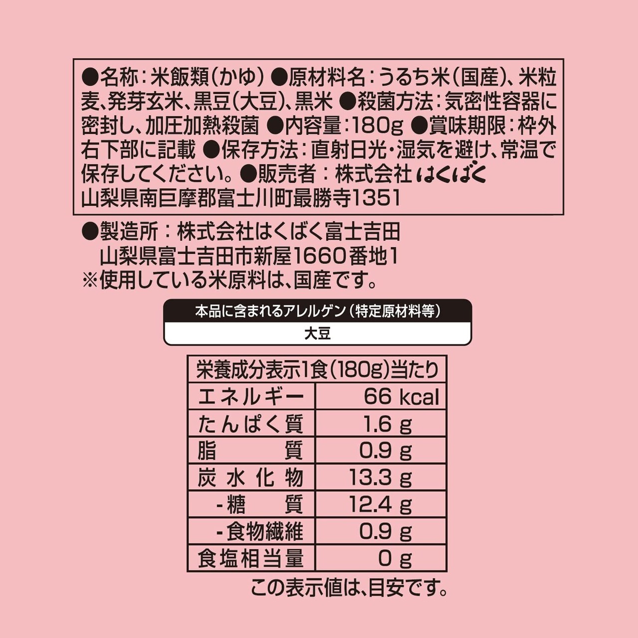 原材料 うるち米(国産)、米粒麦、発芽玄米、黒豆(大豆)、黒米 ※使用している米原料は国産です。