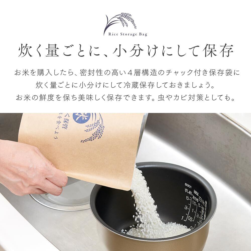 【炊く量ごとに、小分けにして保存】お米を購入したら、密封性の高い4層構造のチャック付き保存袋に炊く量ごとに小分けにして冷蔵保存しておきましょう。お米の鮮度を保ち美味しく保存できます。虫やカビ対策としても。