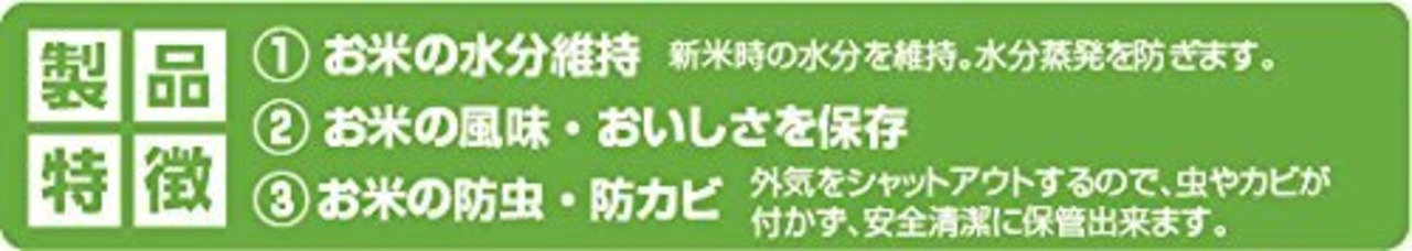 特徴:お米の防虫・防カビ(外気をシャットアウトするので、虫やカビが付かず、安全清潔に保管出来ます。)