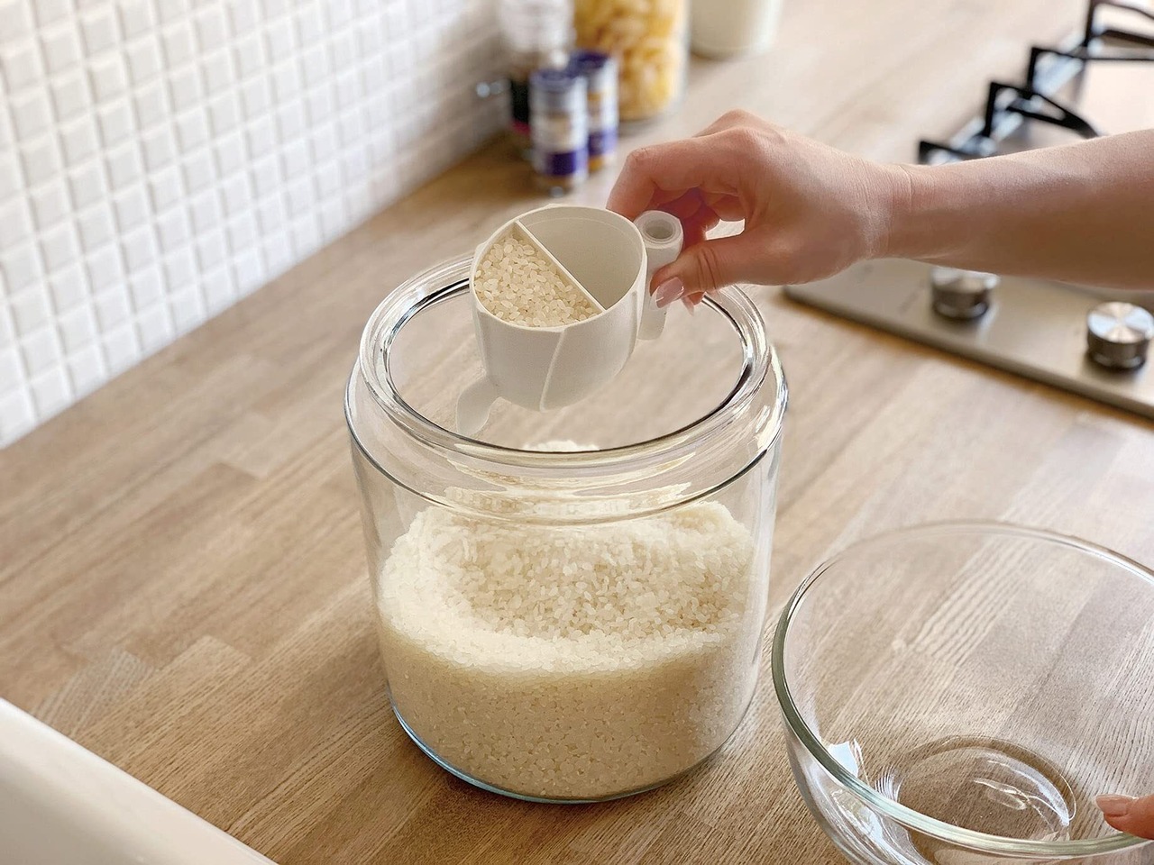 1合、0.5合、無洗米も簡単に量れる、魅せるお米の計量カップです。