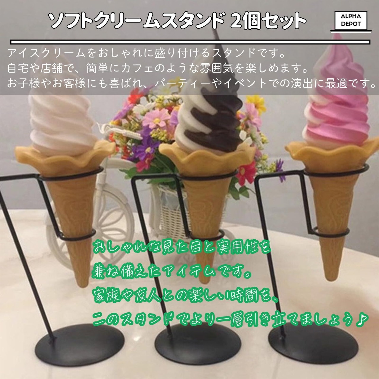 【ソフトクリームスタンド 2個セット】アイスクリームをおしゃれに盛り付けるスタンドです。自宅や店舗で、簡単にカフェのような雰囲気を楽しめます。お子様やお客様にも喜ばれ、パーティーやイベントでの演出に最適です。アイスクリーム屋さんの雰囲気を演出するだけでなく、手作りアイスクリームやデザートを引き立てるアクセサリーとしても大活躍。おしゃれな見た目と実用性を兼ね備えたアイテムです。家族や友人との楽しい時間を、このスタンドでより一層引き立てましょう。