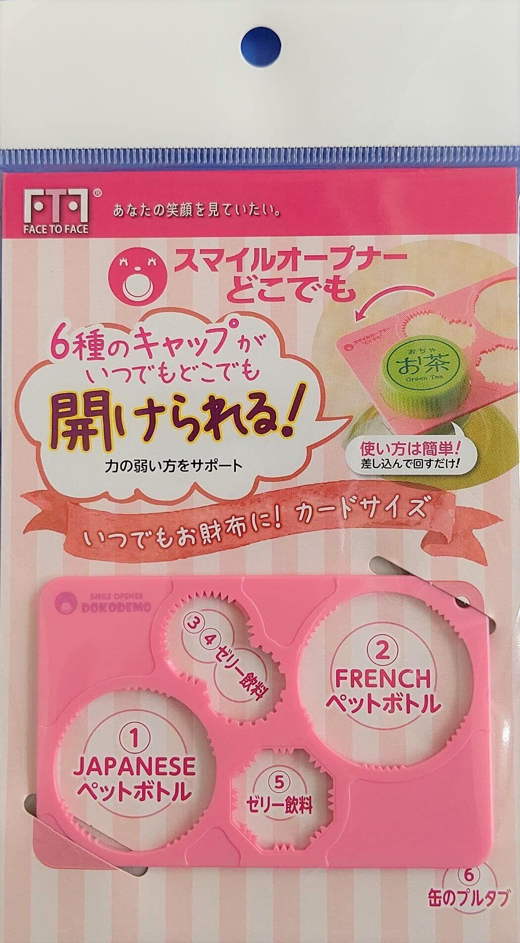 「スマイルオープナーどこでも」は、カードサイズのボトルオープナー。お財布やパスケース等にサッと入って、どもでも持ち運びしやすい!2種類のペットボトルと3種類のゼリー飲料、缶のプルタブ、計6種類のサイズの対応しています。差し込んで回すだけで簡単にオープン!お子様からご高齢の方まで、使いやすくて手軽に携帯できるオープナーです。
