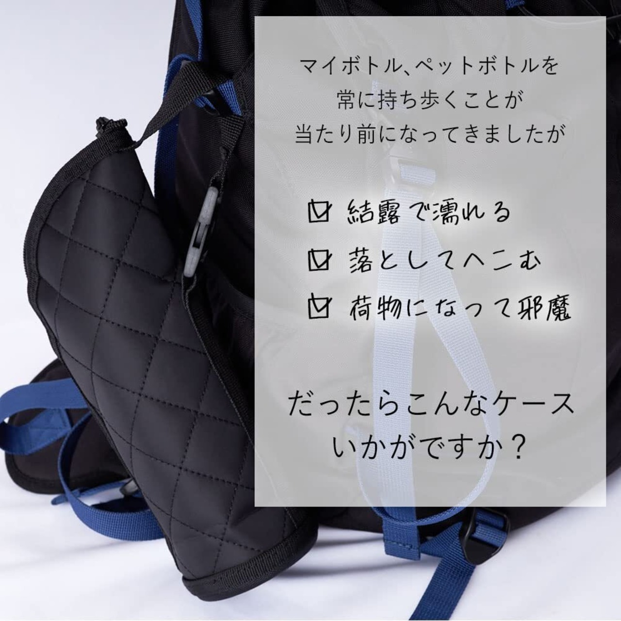 特徴:保温保冷加工、カバンの中が結露で濡れません。リュックやカバンにカチッとバックルで簡単着脱。手が塞がりません。